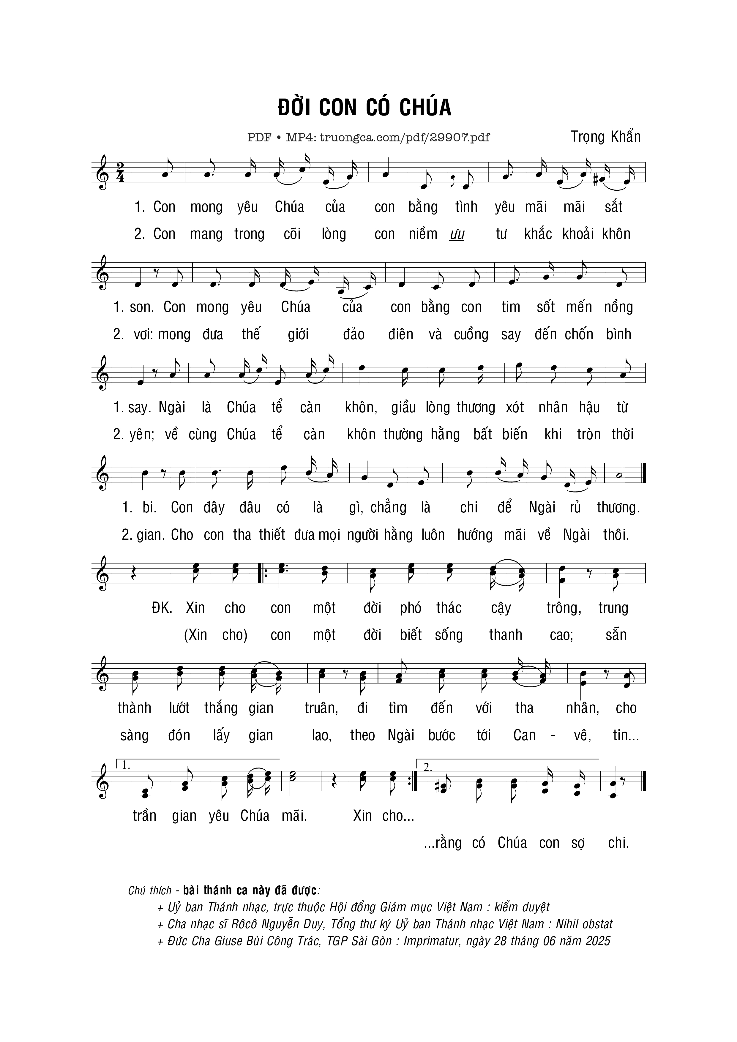 Sheet music Đời con có Chúa by Trọng Khẩn and PDF file was posted here to support you to practice singing perfectly. Sheets with notes and chords are for reference only, for non-commercial purposes only, not involved with earning money by buying and selling. Copyright is belong to song writer/author and copyright owner. Truongca.com do not own any copyrighted content. You can download the high-quality PDF files which contain staffs by PDF link above.