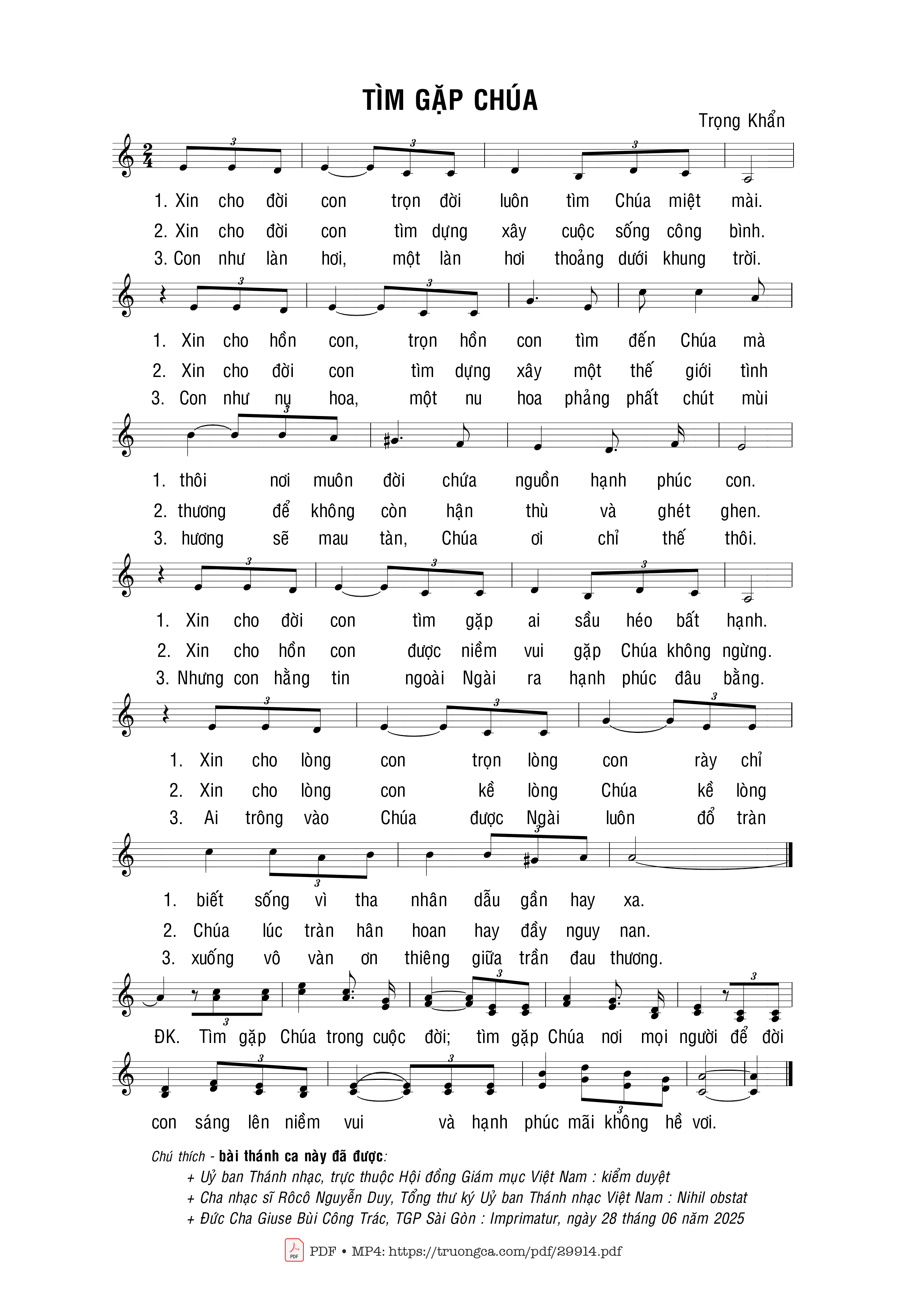 Sheet music Tìm gặp Chúa by Trọng Khẩn and PDF file was posted here to support you to practice singing perfectly. Sheets with notes and chords are for reference only, for non-commercial purposes only, not involved with earning money by buying and selling. Copyright is belong to song writer/author and copyright owner. Truongca.com do not own any copyrighted content. You can download the high-quality PDF files which contain staffs by PDF link above.