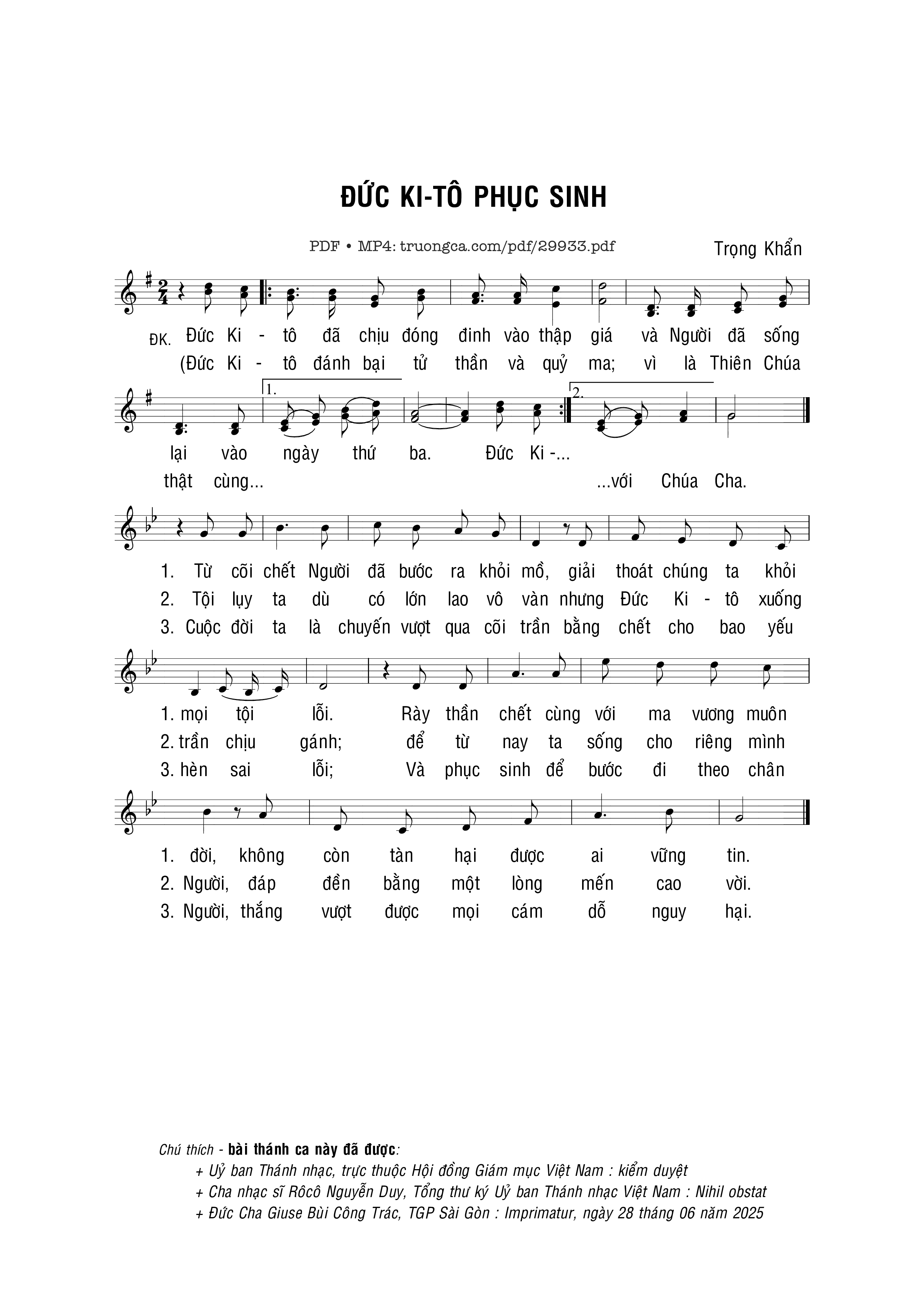 Sheet music Đức Kitô phục sinh by Trọng Khẩn and PDF file was posted here to support you to practice singing perfectly. Sheets with notes and chords are for reference only, for non-commercial purposes only, not involved with earning money by buying and selling. Copyright is belong to song writer/author and copyright owner. Truongca.com do not own any copyrighted content. You can download the high-quality PDF files which contain staffs by PDF link above.