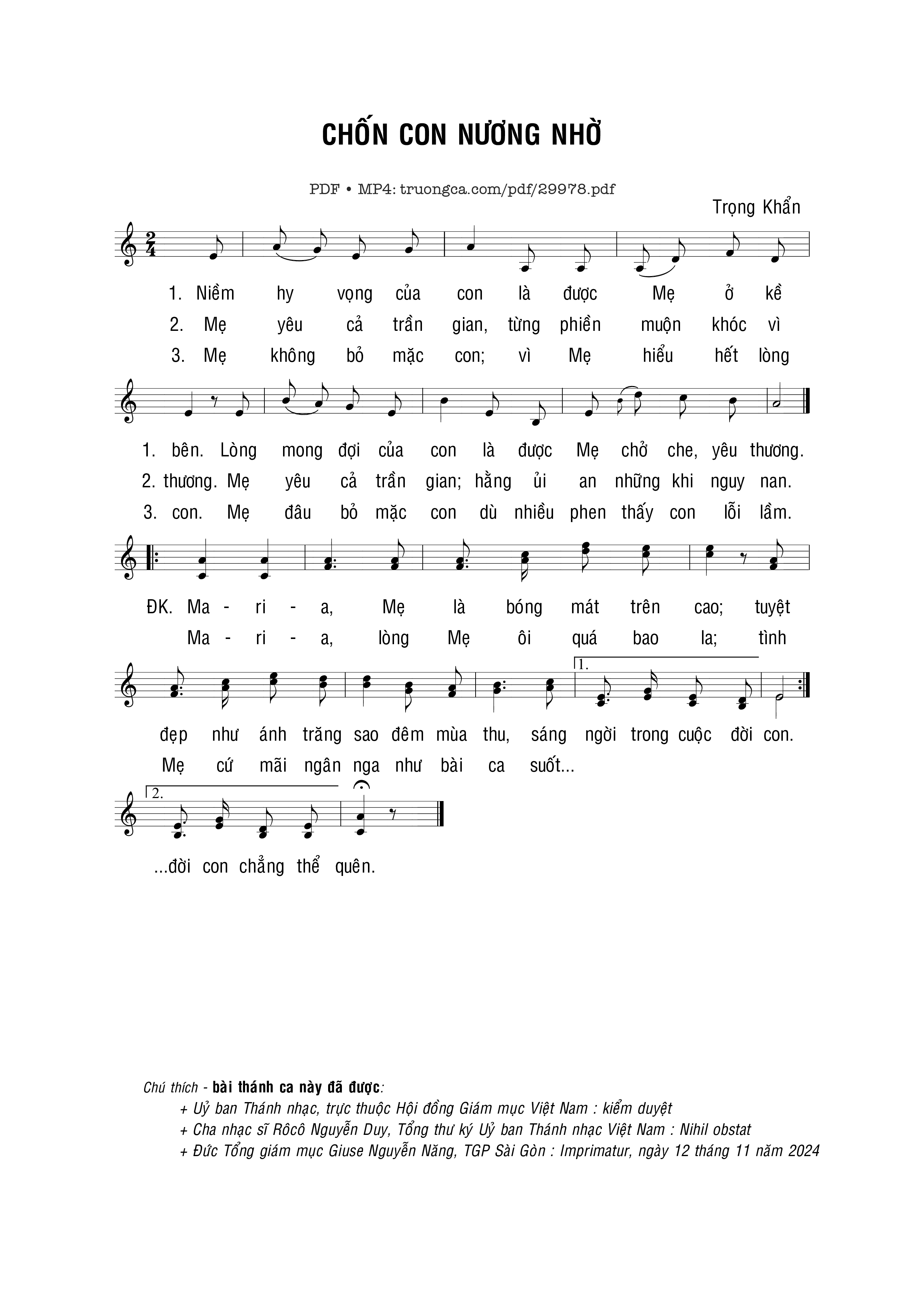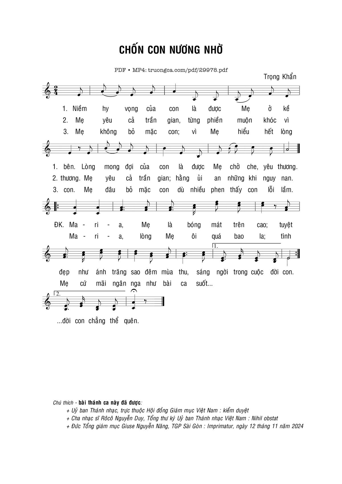 Sheet music Chốn con nương nhờ by Trọng Khẩn and PDF file was posted here to support you to practice singing perfectly. Sheets with notes and chords are for reference only, for non-commercial purposes only, not involved with earning money by buying and selling. Copyright is belong to song writer/author and copyright owner. Truongca.com do not own any copyrighted content. You can download the high-quality PDF files which contain staffs by PDF link above.
