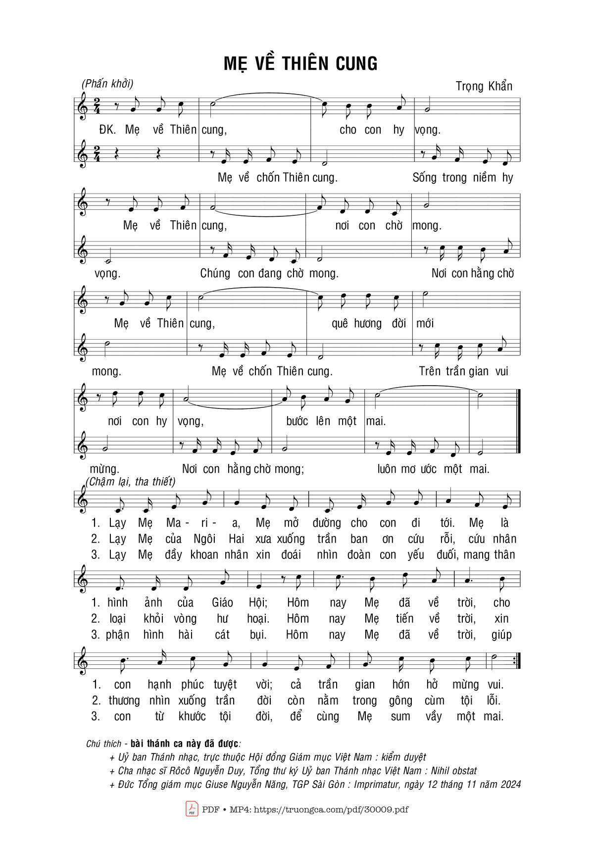 Sheet music Mẹ về Thiên Cung by Trọng Khẩn and PDF file was posted here to support you to practice singing perfectly. Sheets with notes and chords are for reference only, for non-commercial purposes only, not involved with earning money by buying and selling. Copyright is belong to song writer/author and copyright owner. Truongca.com do not own any copyrighted content. You can download the high-quality PDF files which contain staffs by PDF link above.