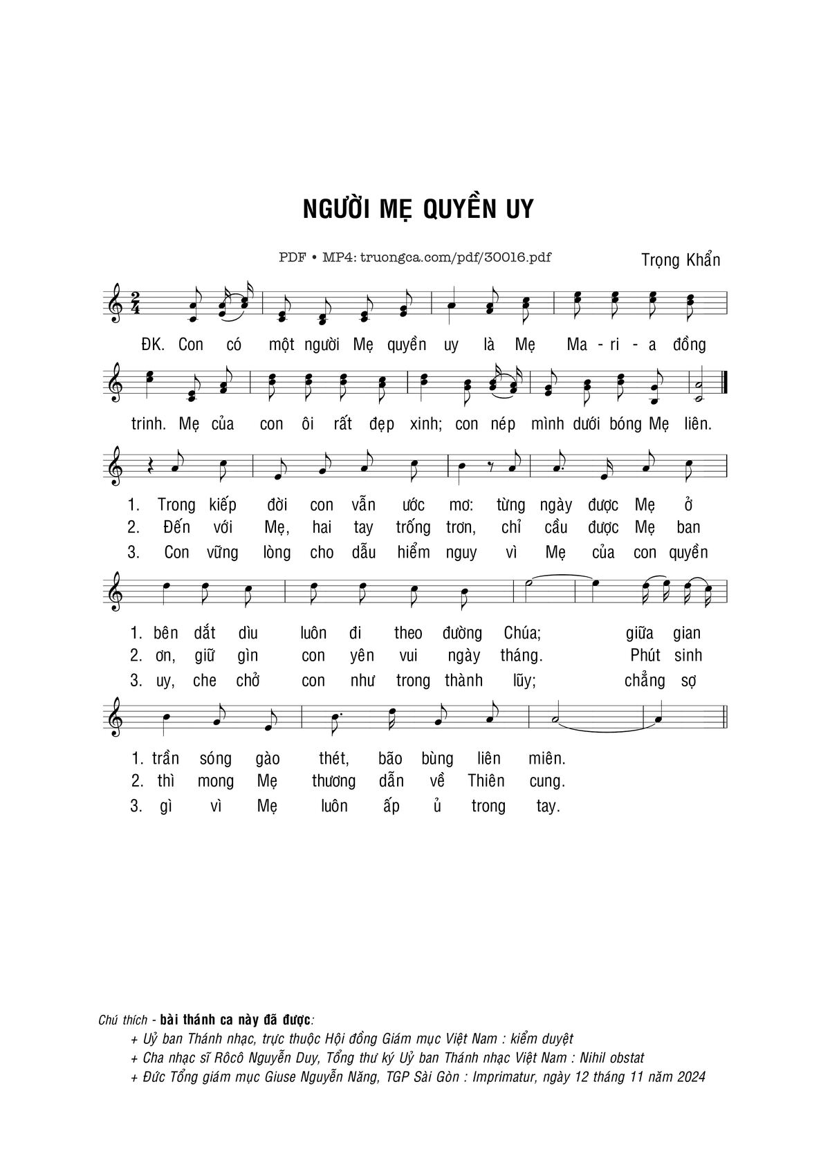 Sheet music Người Mẹ quyền uy by Trọng Khẩn and PDF file was posted here to support you to practice singing perfectly. Sheets with notes and chords are for reference only, for non-commercial purposes only, not involved with earning money by buying and selling. Copyright is belong to song writer/author and copyright owner. Truongca.com do not own any copyrighted content. You can download the high-quality PDF files which contain staffs by PDF link above.