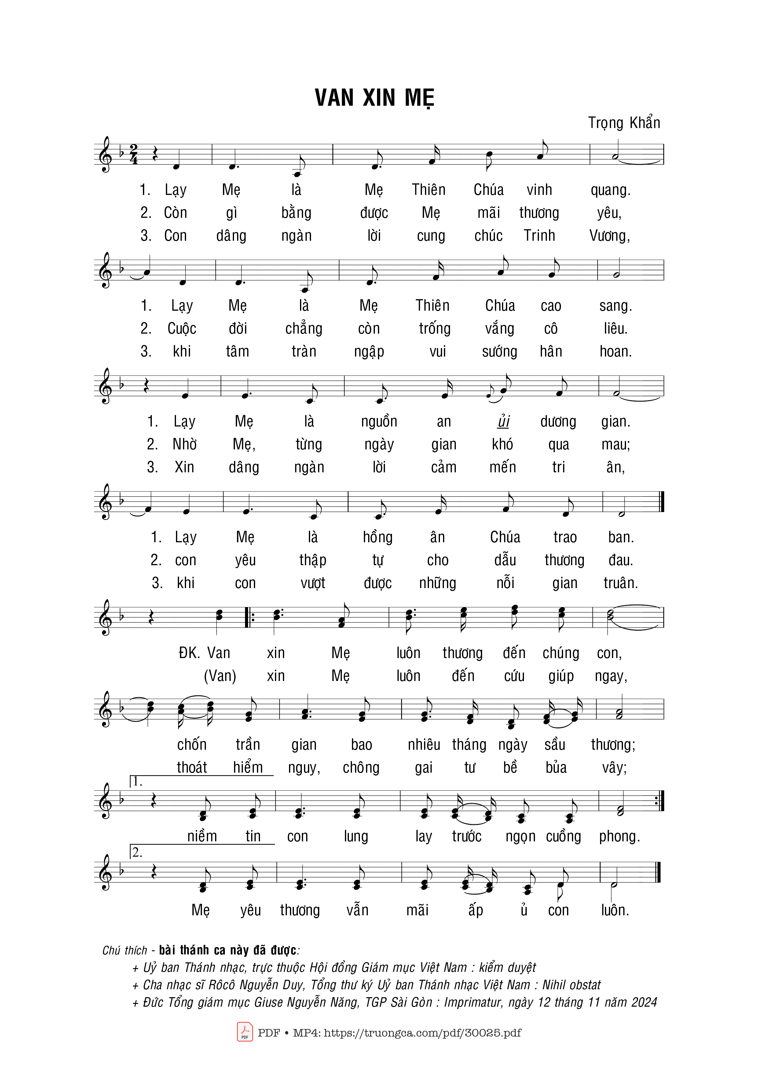 Sheet music Van xin Mẹ by Trọng Khẩn and PDF file was posted here to support you to practice singing perfectly. Sheets with notes and chords are for reference only, for non-commercial purposes only, not involved with earning money by buying and selling. Copyright is belong to song writer/author and copyright owner. Truongca.com do not own any copyrighted content. You can download the high-quality PDF files which contain staffs by PDF link above.