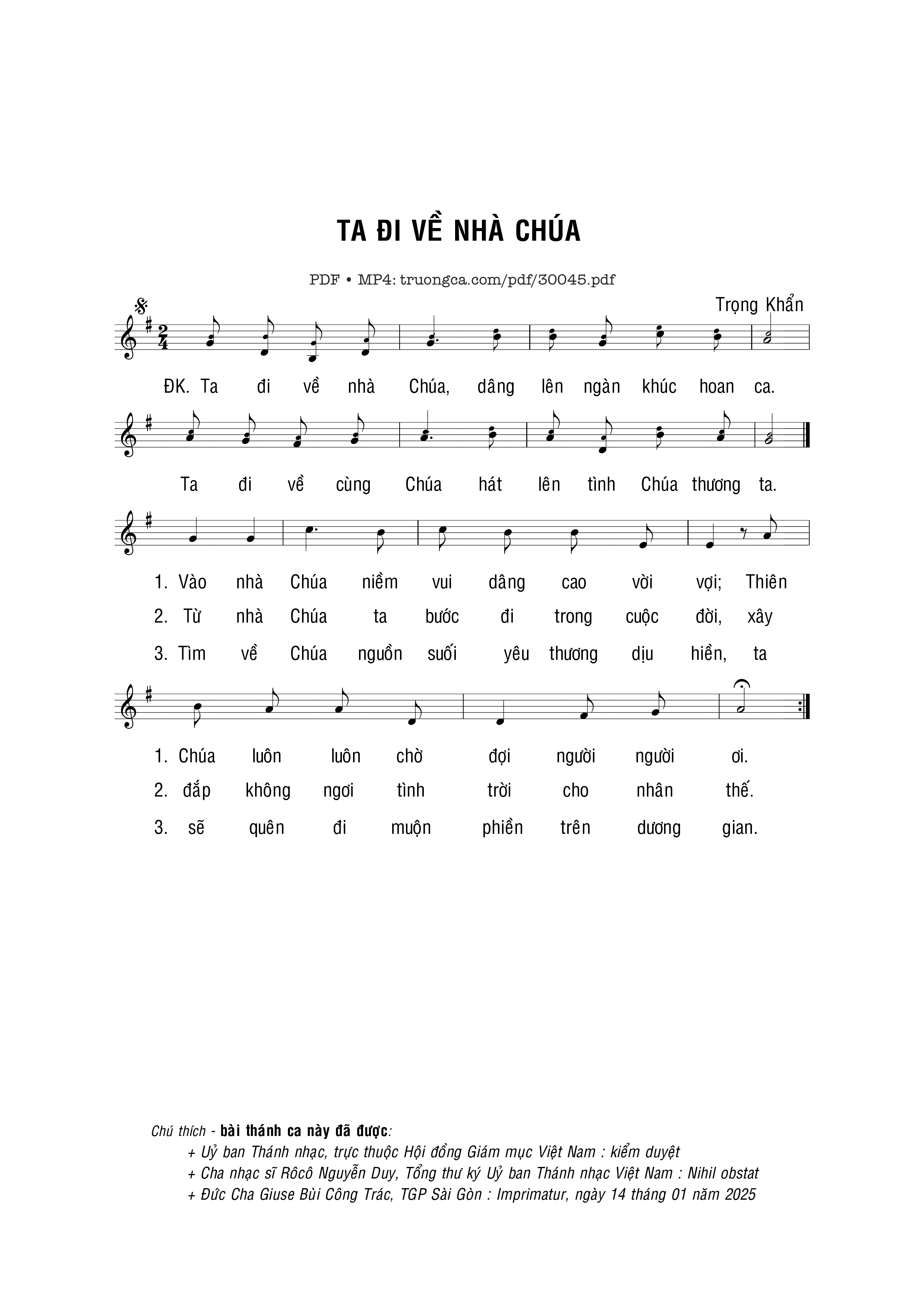 Sheet music Ta đi về nhà Chúa by Trọng Khẩn and PDF file was posted here to support you to practice singing perfectly. Sheets with notes and chords are for reference only, for non-commercial purposes only, not involved with earning money by buying and selling. Copyright is belong to song writer/author and copyright owner. Truongca.com do not own any copyrighted content. You can download the high-quality PDF files which contain staffs by PDF link above.