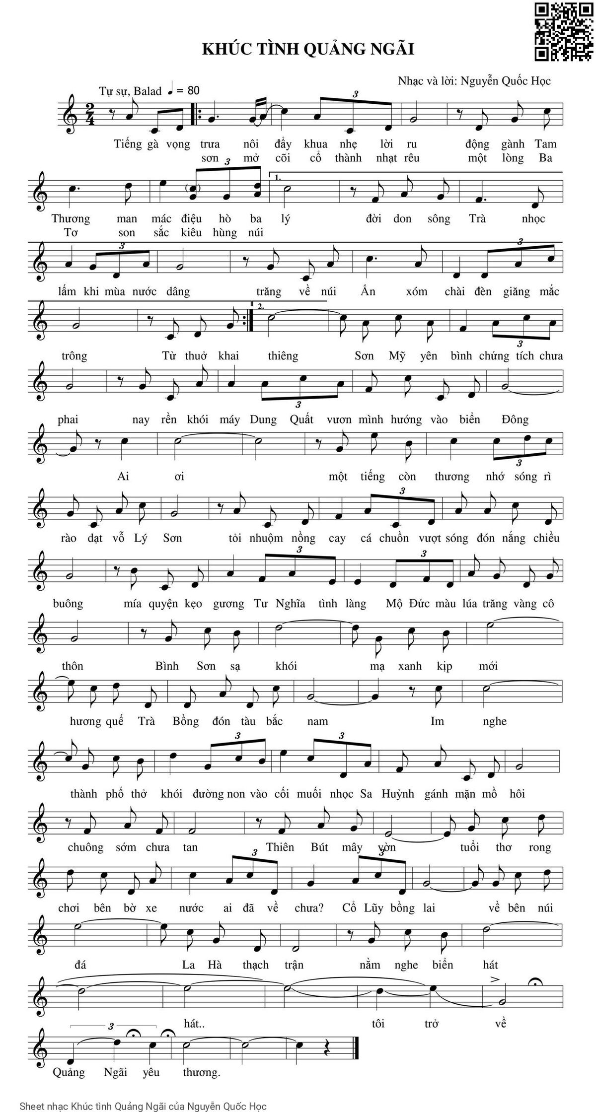 The Videos/audios Khúc tình Quảng Ngãi by Nguyễn Quốc Học were embed from Youtube, Musescore or the other 3rd links. Videos are subject to 3rd's copyright control and may be removed by YouTube's copyright rules and 3rd's policies or maybe included advertisements. If you cannot access to these songs, this mean that have been removed.