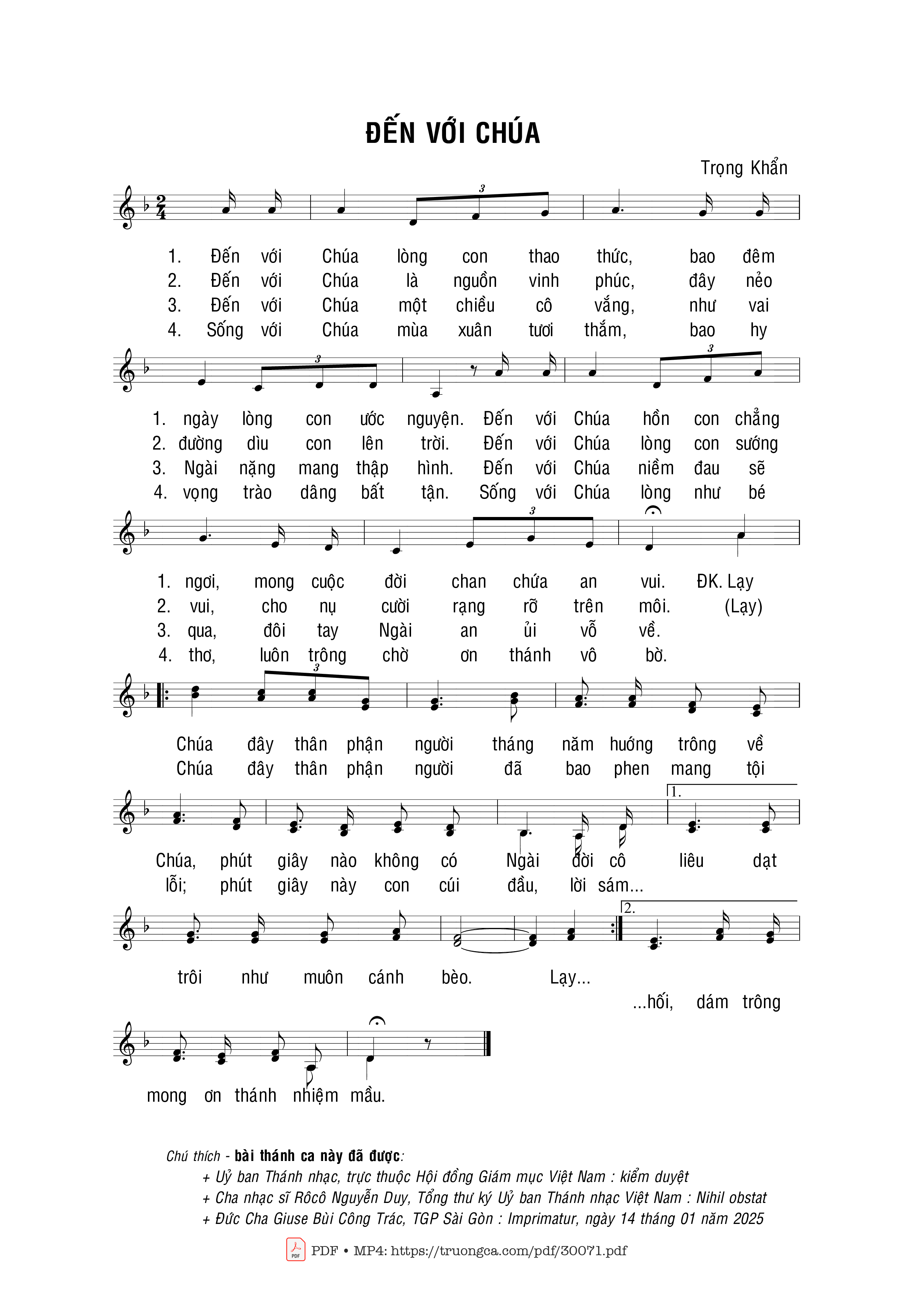Sheet music Đến với Chúa by Trọng Khẩn and PDF file was posted here to support you to practice singing perfectly. Sheets with notes and chords are for reference only, for non-commercial purposes only, not involved with earning money by buying and selling. Copyright is belong to song writer/author and copyright owner. Truongca.com do not own any copyrighted content. You can download the high-quality PDF files which contain staffs by PDF link above.