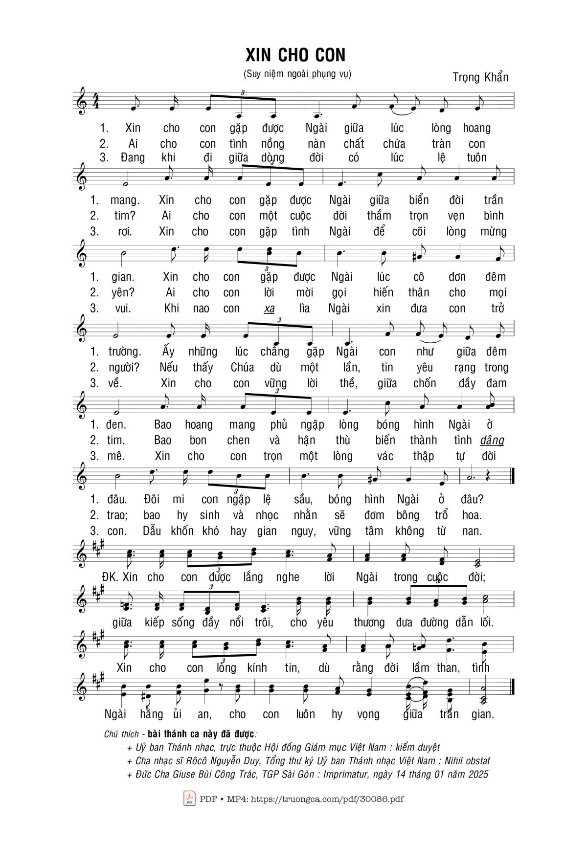 Sheet music Xin cho con by Trọng Khẩn and PDF file was posted here to support you to practice singing perfectly. Sheets with notes and chords are for reference only, for non-commercial purposes only, not involved with earning money by buying and selling. Copyright is belong to song writer/author and copyright owner. Truongca.com do not own any copyrighted content. You can download the high-quality PDF files which contain staffs by PDF link above.