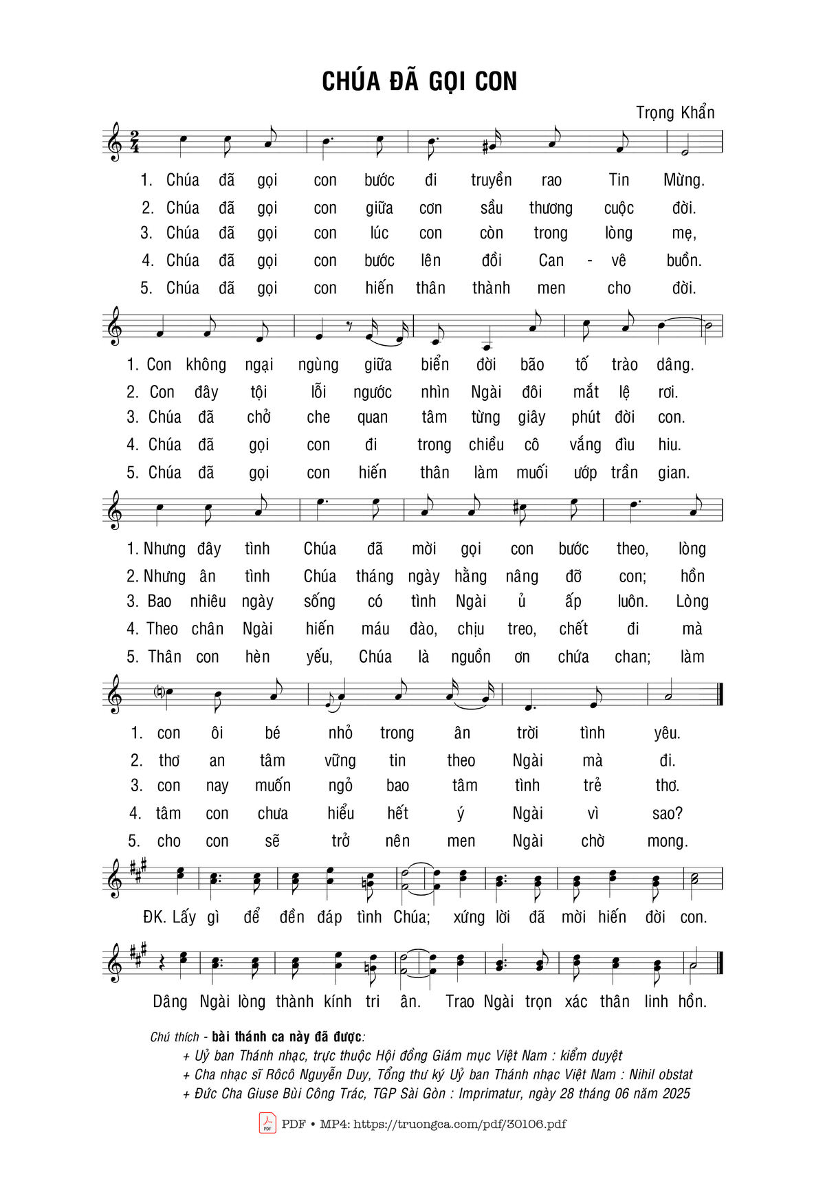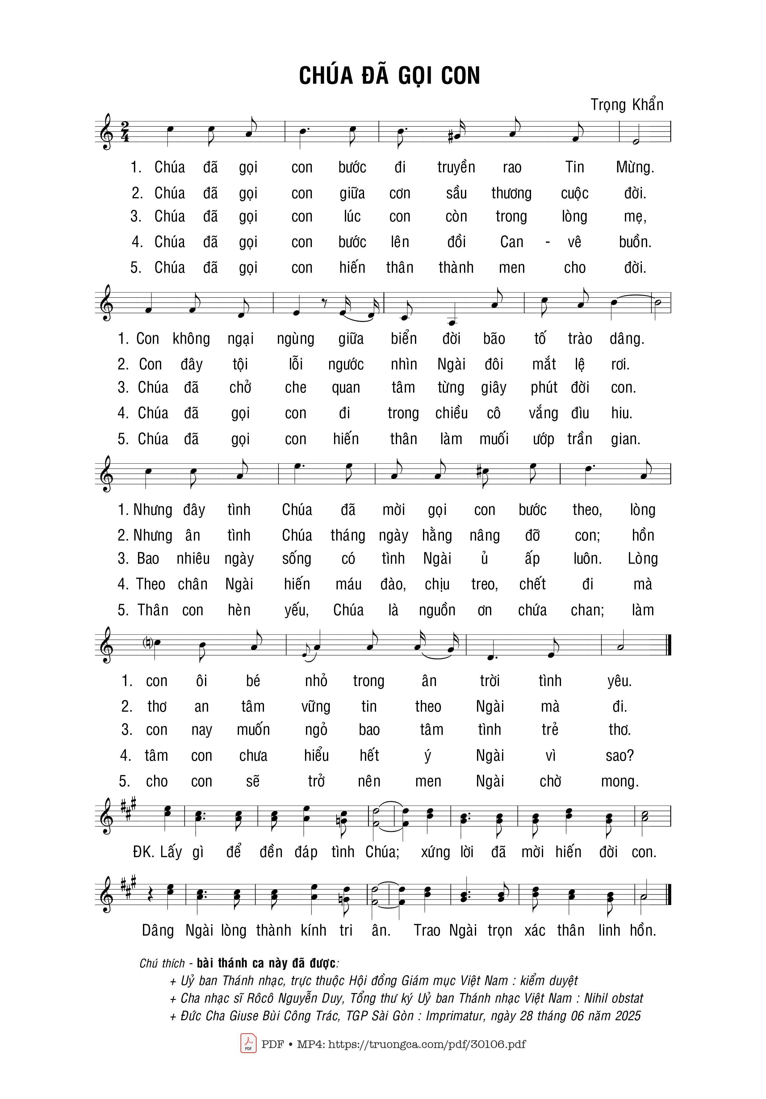 Sheet music Chúa Đã Gọi Con by Trọng Khẩn and PDF file was posted here to support you to practice singing perfectly. Sheets with notes and chords are for reference only, for non-commercial purposes only, not involved with earning money by buying and selling. Copyright is belong to song writer/author and copyright owner. Truongca.com do not own any copyrighted content. You can download the high-quality PDF files which contain staffs by PDF link above.