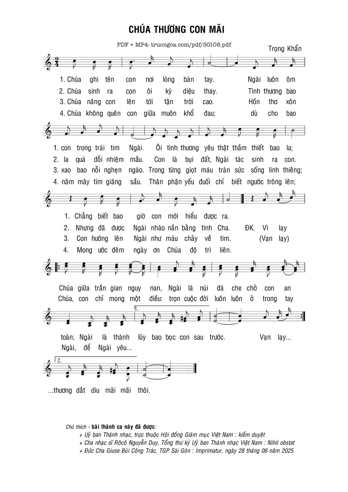 Sheet music Chúa thương con mãi by Trọng Khẩn and PDF file was posted here to support you to practice singing perfectly. Sheets with notes and chords are for reference only, for non-commercial purposes only, not involved with earning money by buying and selling. Copyright is belong to song writer/author and copyright owner. Truongca.com do not own any copyrighted content. You can download the high-quality PDF files which contain staffs by PDF link above.