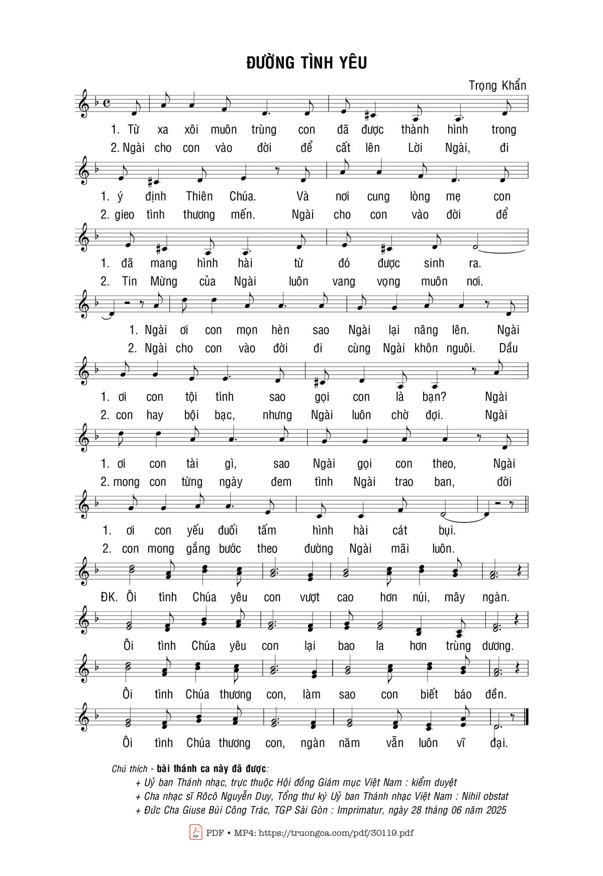 Sheet music Đường tình yêu by Trọng Khẩn and PDF file was posted here to support you to practice singing perfectly. Sheets with notes and chords are for reference only, for non-commercial purposes only, not involved with earning money by buying and selling. Copyright is belong to song writer/author and copyright owner. Truongca.com do not own any copyrighted content. You can download the high-quality PDF files which contain staffs by PDF link above.