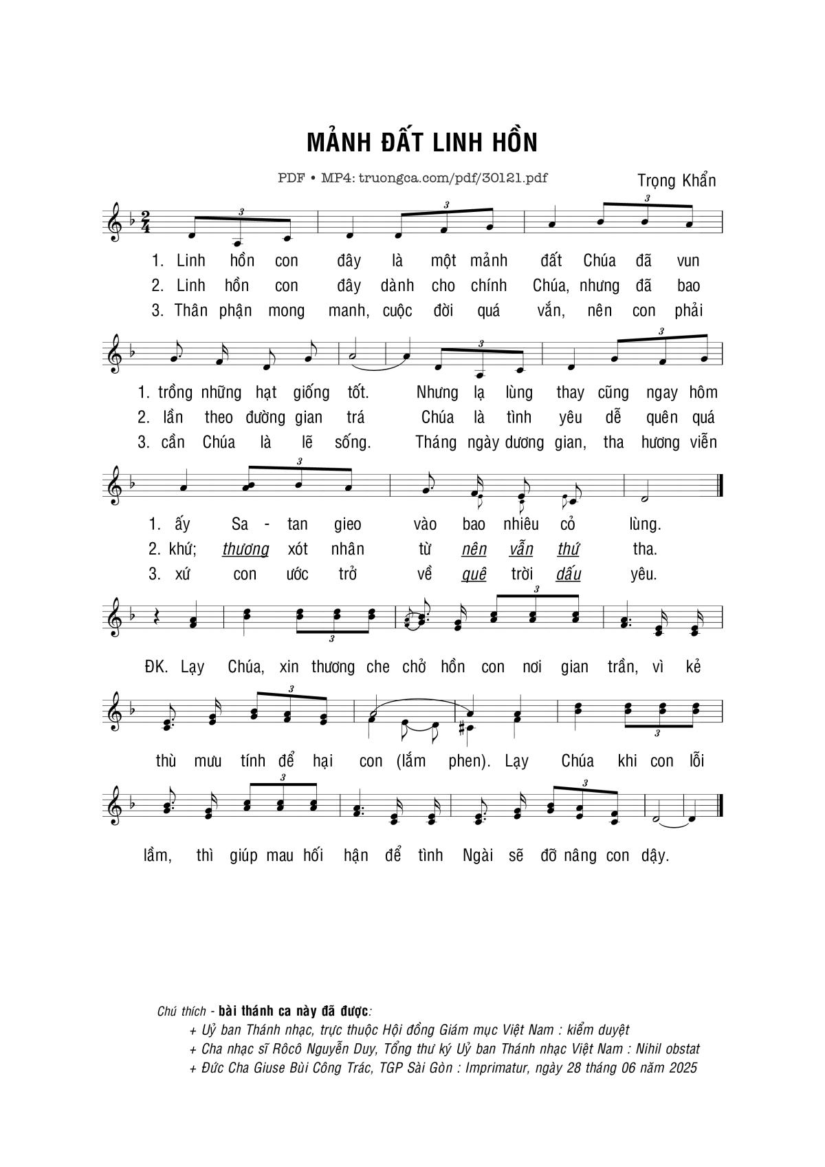 Sheet music Mảnh đất linh hồn by Trọng Khẩn and PDF file was posted here to support you to practice singing perfectly. Sheets with notes and chords are for reference only, for non-commercial purposes only, not involved with earning money by buying and selling. Copyright is belong to song writer/author and copyright owner. Truongca.com do not own any copyrighted content. You can download the high-quality PDF files which contain staffs by PDF link above.