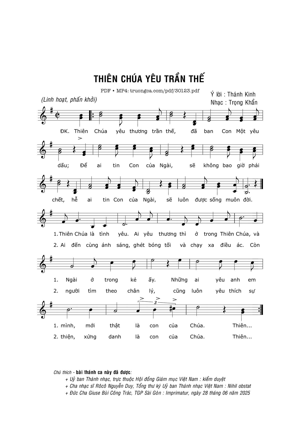 Sheet music Thiên Chúa yêu trần thế by Trọng Khẩn and PDF file was posted here to support you to practice singing perfectly. Sheets with notes and chords are for reference only, for non-commercial purposes only, not involved with earning money by buying and selling. Copyright is belong to song writer/author and copyright owner. Truongca.com do not own any copyrighted content. You can download the high-quality PDF files which contain staffs by PDF link above.