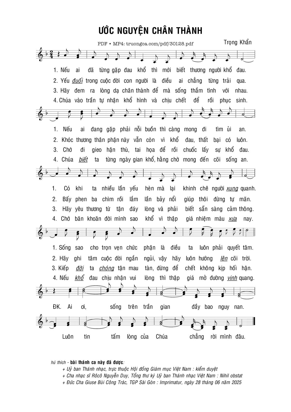 Sheet music Ước nguyện chân thành by Trọng Khẩn and PDF file was posted here to support you to practice singing perfectly. Sheets with notes and chords are for reference only, for non-commercial purposes only, not involved with earning money by buying and selling. Copyright is belong to song writer/author and copyright owner. Truongca.com do not own any copyrighted content. You can download the high-quality PDF files which contain staffs by PDF link above.