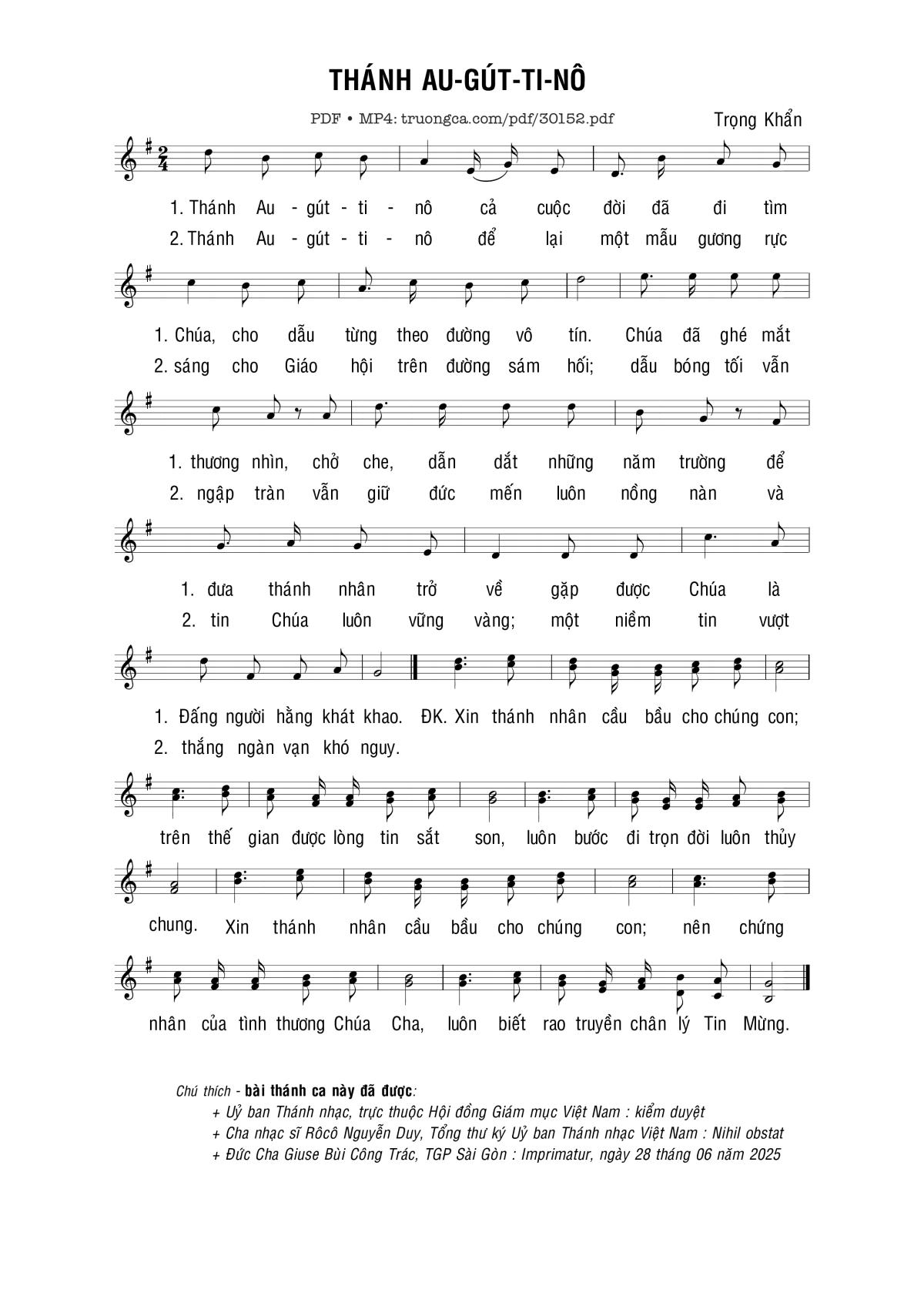 Sheet music THánh Au-gút-ti-nô by Trọng Khẩn and PDF file was posted here to support you to practice singing perfectly. Sheets with notes and chords are for reference only, for non-commercial purposes only, not involved with earning money by buying and selling. Copyright is belong to song writer/author and copyright owner. Truongca.com do not own any copyrighted content. You can download the high-quality PDF files which contain staffs by PDF link above.