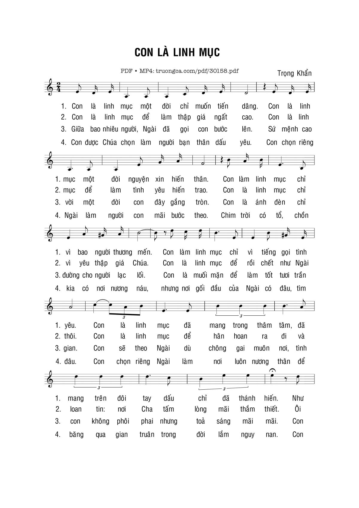 Sheet music Con là Linh mục by Trọng Khẩn and PDF file was posted here to support you to practice singing perfectly. Sheets with notes and chords are for reference only, for non-commercial purposes only, not involved with earning money by buying and selling. Copyright is belong to song writer/author and copyright owner. Truongca.com do not own any copyrighted content. You can download the high-quality PDF files which contain staffs by PDF link above.