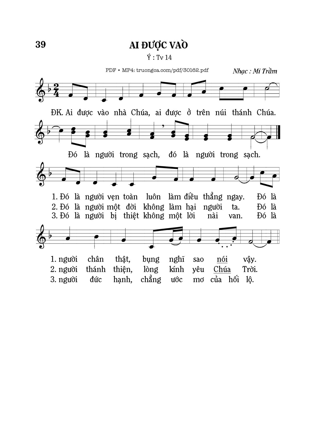 Transposition is the process of moving a song's melody and chords up or down in pitch by a constant interval. The direction of the transposition tool is indicated by a plus (+) sign for up and a minus (-) sign for down. Hover mouse over chords signs to see the chords chart of Ai được vào (Tv. 14) song.