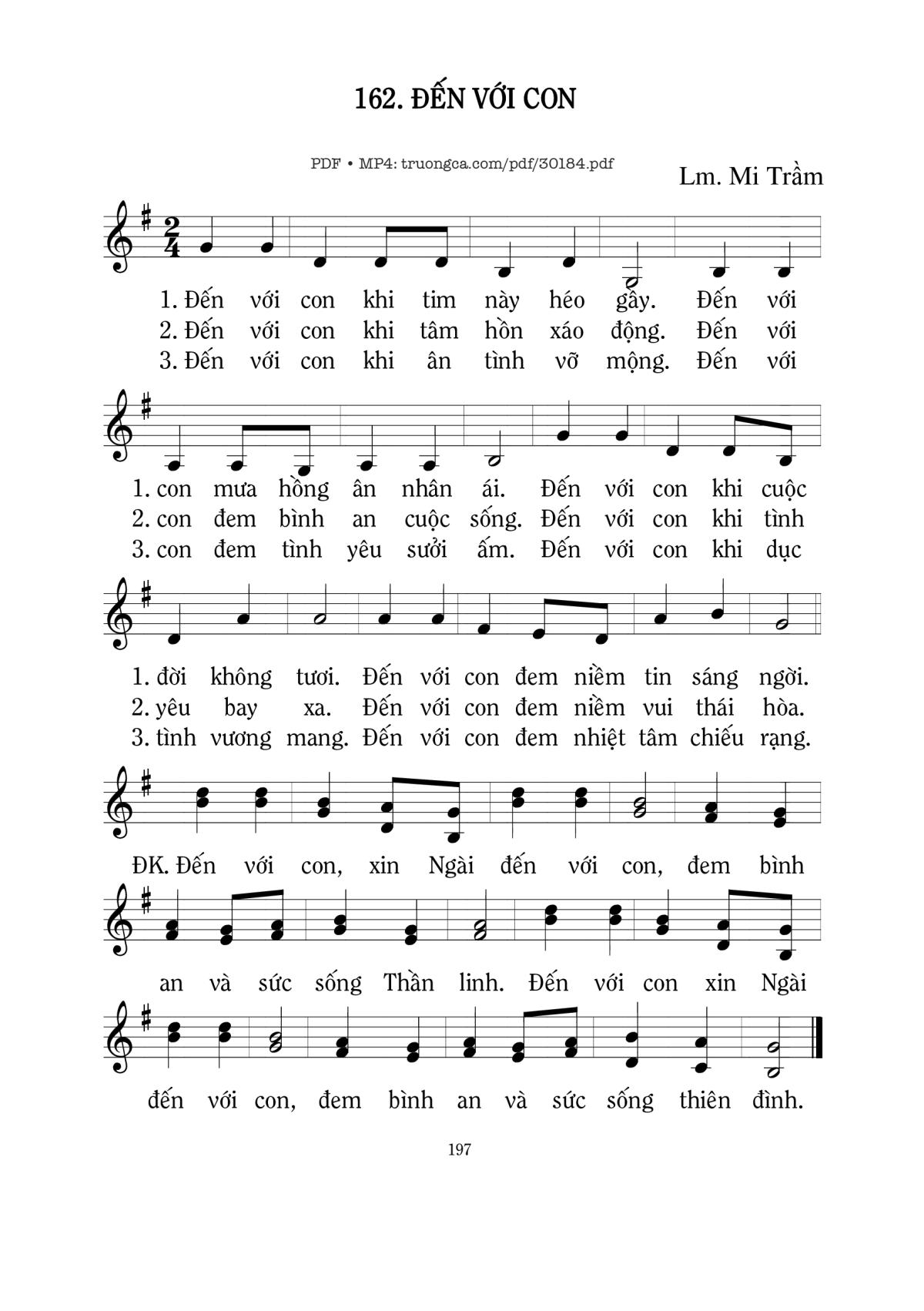 Sheet music Đến với con by Mi Trầm and PDF file was posted here to support you to practice singing perfectly. Sheets with notes and chords are for reference only, for non-commercial purposes only, not involved with earning money by buying and selling. Copyright is belong to song writer/author and copyright owner. Truongca.com do not own any copyrighted content. You can download the high-quality PDF files which contain staffs by PDF link above.