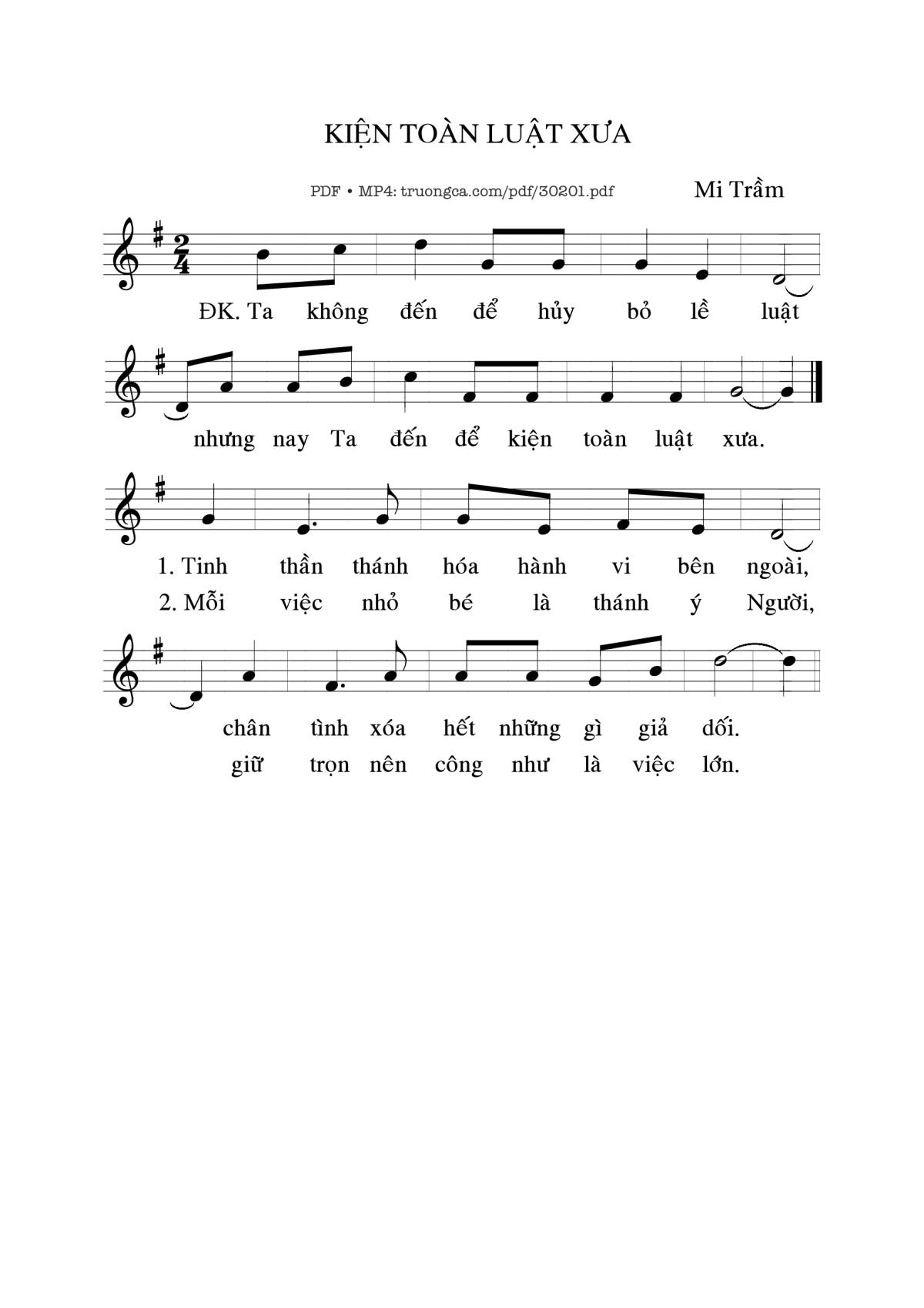 Sheet music Kiện toàn luật xưa by Mi Trầm and PDF file was posted here to support you to practice singing perfectly. Sheets with notes and chords are for reference only, for non-commercial purposes only, not involved with earning money by buying and selling. Copyright is belong to song writer/author and copyright owner. Truongca.com do not own any copyrighted content. You can download the high-quality PDF files which contain staffs by PDF link above.