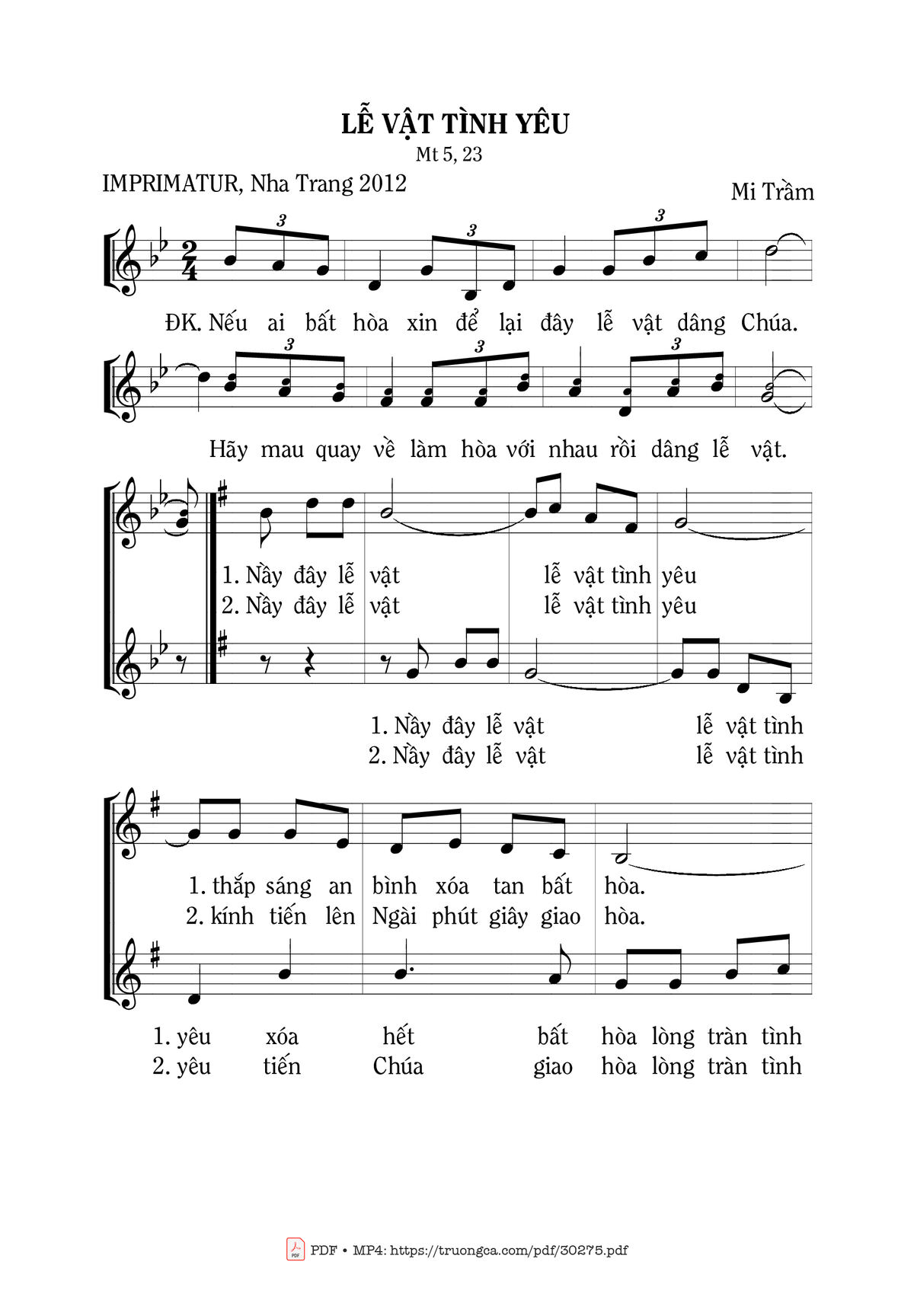 Sheet music Lễ Vật Tình Yêu by Mi Trầm and PDF file was posted here to support you to practice singing perfectly. Sheets with notes and chords are for reference only, for non-commercial purposes only, not involved with earning money by buying and selling. Copyright is belong to song writer/author and copyright owner. Truongca.com do not own any copyrighted content. You can download the high-quality PDF files which contain staffs by PDF link above.