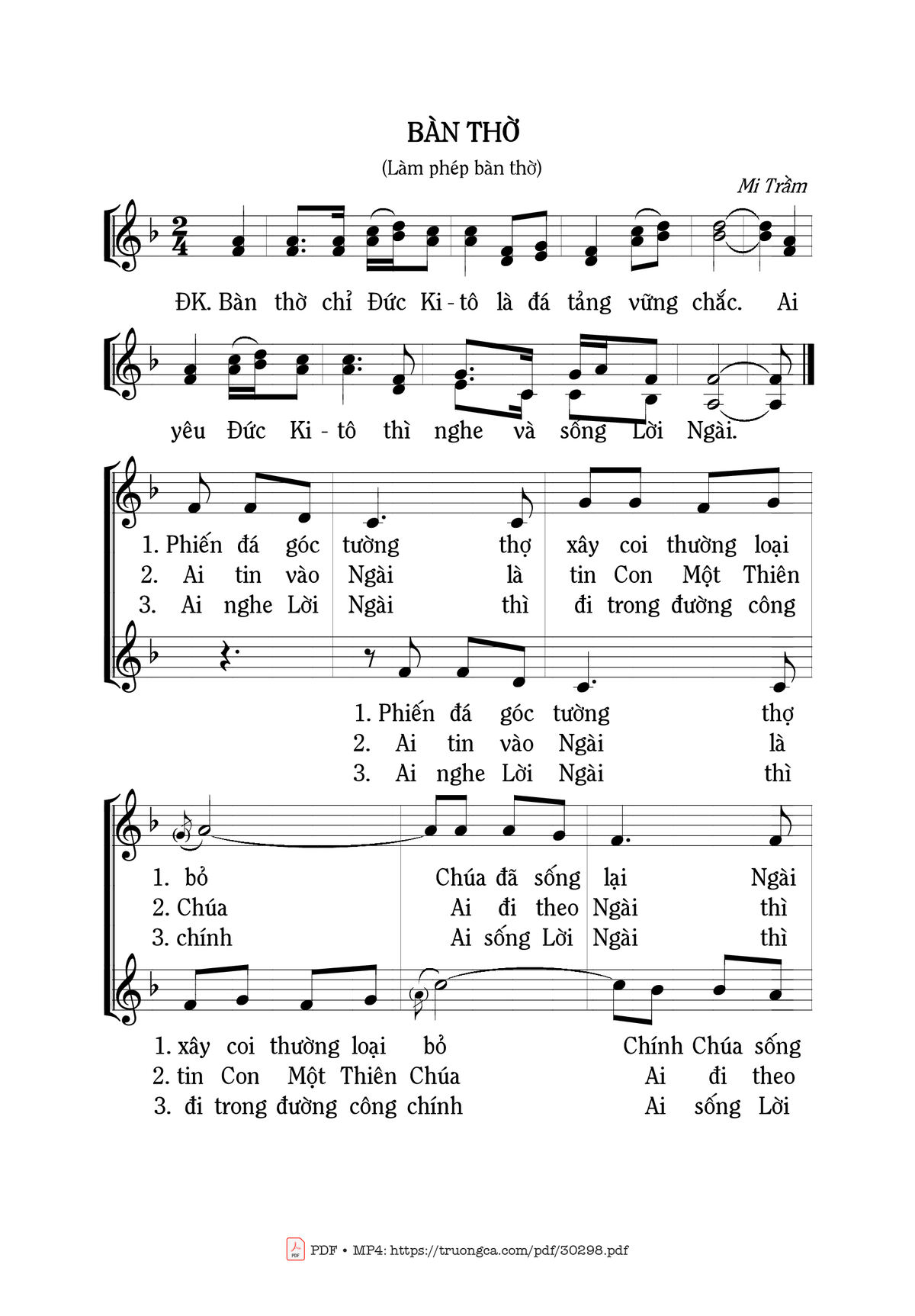 Sheet music Bàn Thờ by Mi Trầm and PDF file was posted here to support you to practice singing perfectly. Sheets with notes and chords are for reference only, for non-commercial purposes only, not involved with earning money by buying and selling. Copyright is belong to song writer/author and copyright owner. Truongca.com do not own any copyrighted content. You can download the high-quality PDF files which contain staffs by PDF link above.