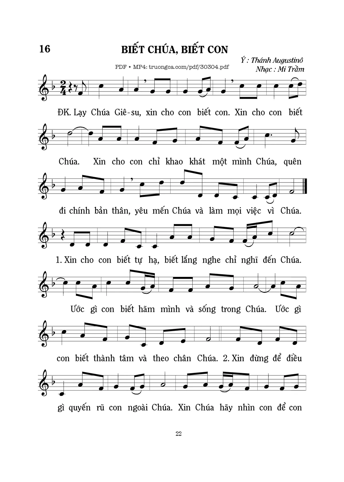 Sheet music Biết Chúa, biết con by Mi Trầm and PDF file was posted here to support you to practice singing perfectly. Sheets with notes and chords are for reference only, for non-commercial purposes only, not involved with earning money by buying and selling. Copyright is belong to song writer/author and copyright owner. Truongca.com do not own any copyrighted content. You can download the high-quality PDF files which contain staffs by PDF link above.