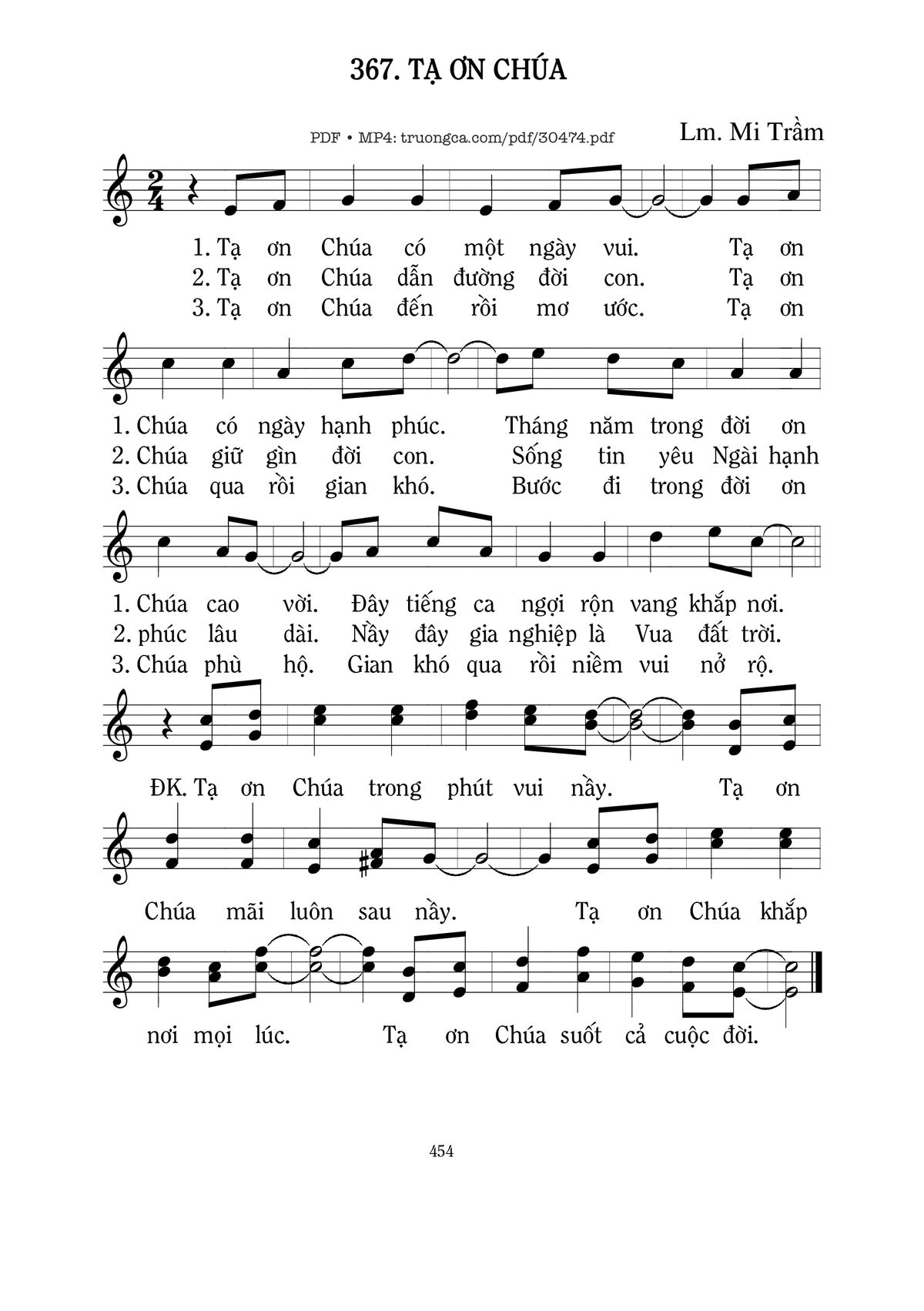 Sheet music Tạ Ơn Chúa by Mi Trầm and PDF file was posted here to support you to practice singing perfectly. Sheets with notes and chords are for reference only, for non-commercial purposes only, not involved with earning money by buying and selling. Copyright is belong to song writer/author and copyright owner. Truongca.com do not own any copyrighted content. You can download the high-quality PDF files which contain staffs by PDF link above.