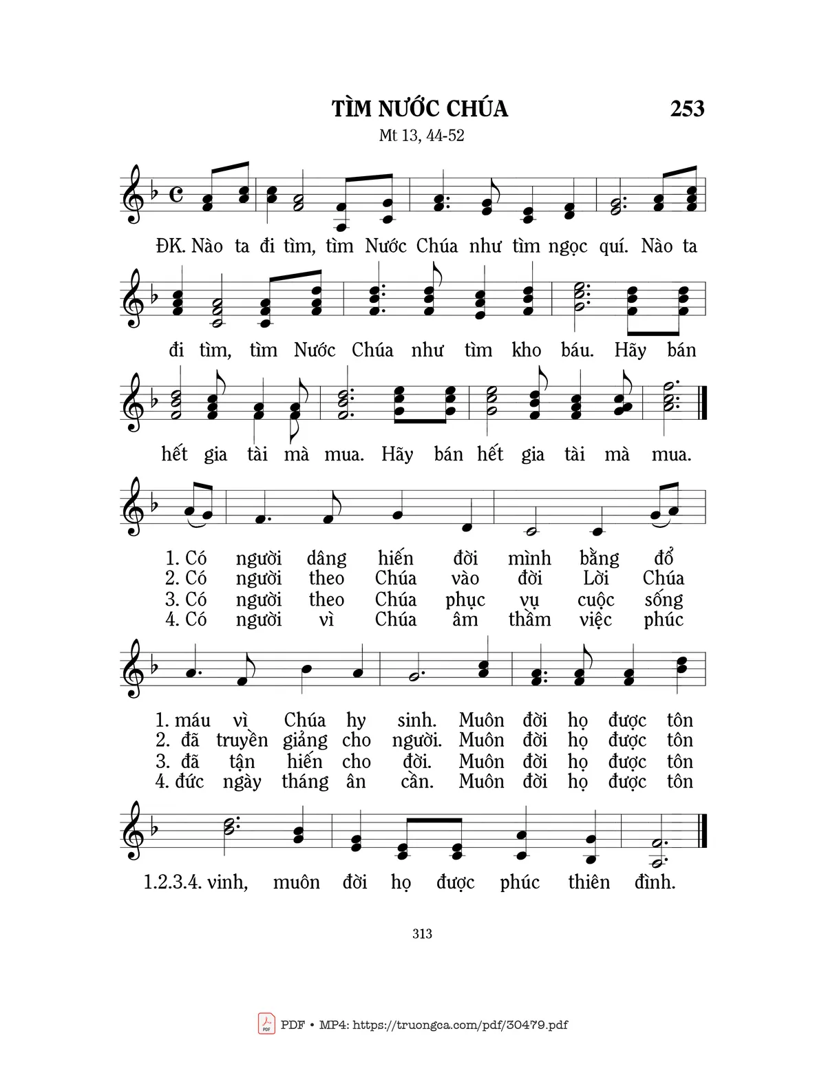 Sheet music Tìm Nước Chúa by Mi Trầm and PDF file was posted here to support you to practice singing perfectly. Sheets with notes and chords are for reference only, for non-commercial purposes only, not involved with earning money by buying and selling. Copyright is belong to song writer/author and copyright owner. Truongca.com do not own any copyrighted content. You can download the high-quality PDF files which contain staffs by PDF link above.
