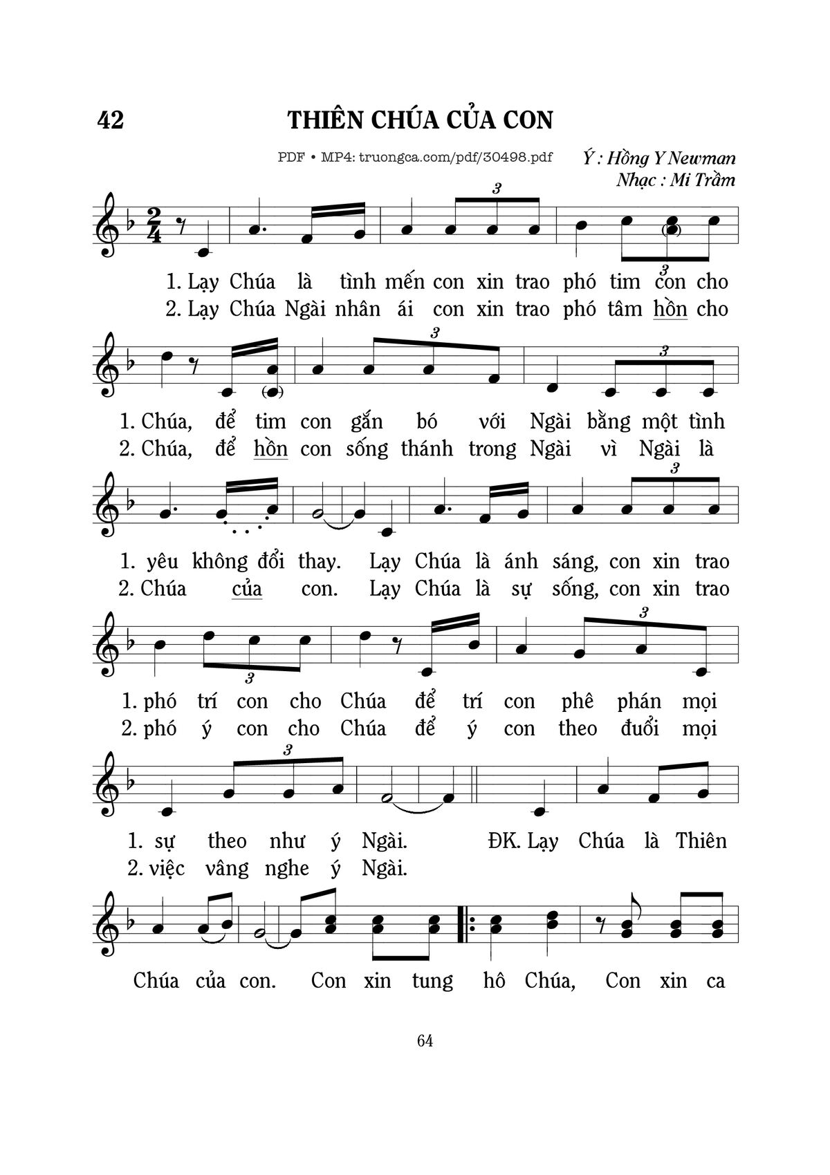 Sheet music Thiên Chúa của con by Mi Trầm and PDF file was posted here to support you to practice singing perfectly. Sheets with notes and chords are for reference only, for non-commercial purposes only, not involved with earning money by buying and selling. Copyright is belong to song writer/author and copyright owner. Truongca.com do not own any copyrighted content. You can download the high-quality PDF files which contain staffs by PDF link above.