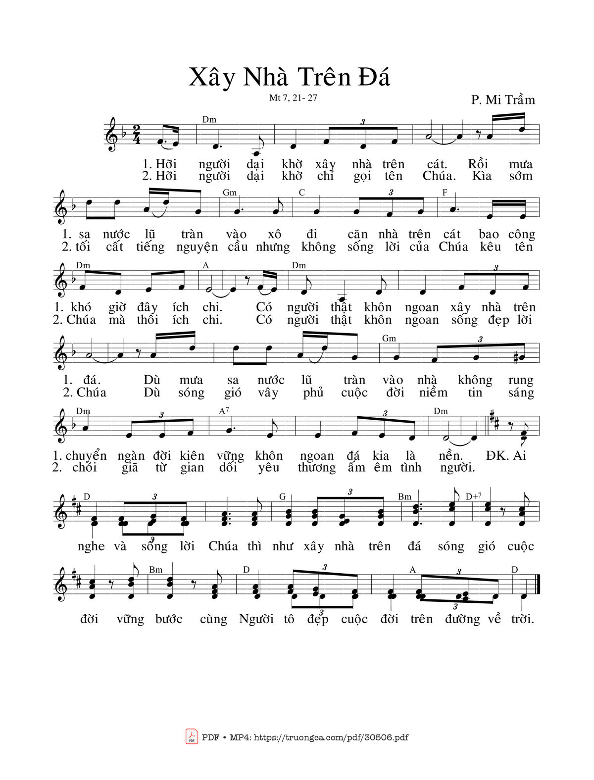 Sheet music Xây Nhà Trên Đá by Mi Trầm and PDF file was posted here to support you to practice singing perfectly. Sheets with notes and chords are for reference only, for non-commercial purposes only, not involved with earning money by buying and selling. Copyright is belong to song writer/author and copyright owner. Truongca.com do not own any copyrighted content. You can download the high-quality PDF files which contain staffs by PDF link above.