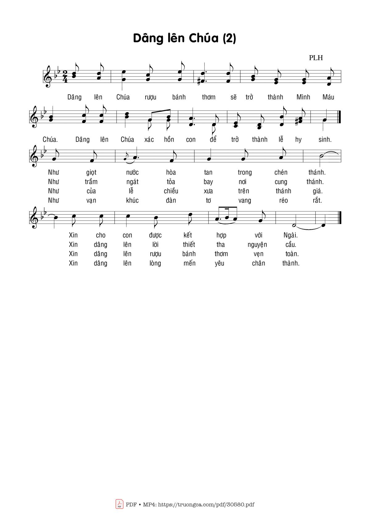 Sheet music Dâng lên Chúa 2 by Phạm Liên Hùng and PDF file was posted here to support you to practice singing perfectly. Sheets with notes and chords are for reference only, for non-commercial purposes only, not involved with earning money by buying and selling. Copyright is belong to song writer/author and copyright owner. Truongca.com do not own any copyrighted content. You can download the high-quality PDF files which contain staffs by PDF link above.