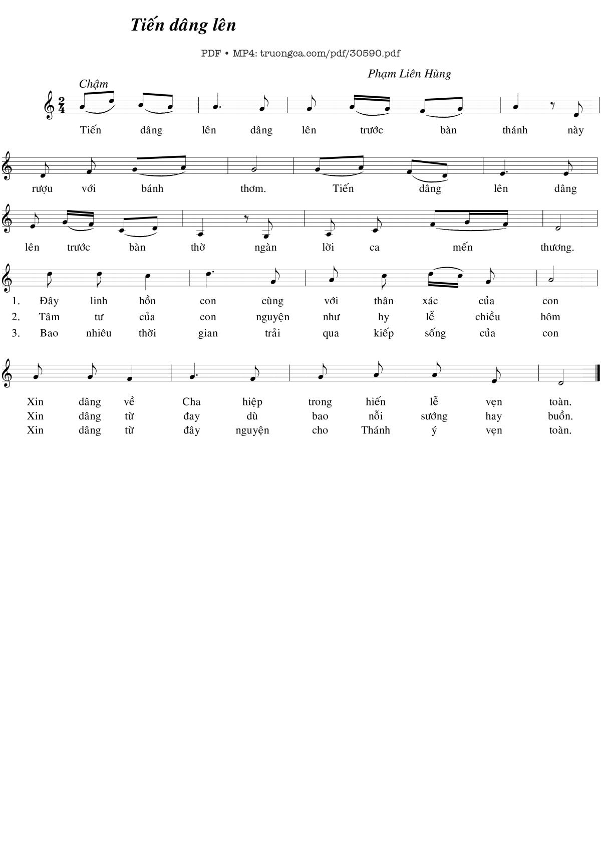 Sheet music Tiến dâng lên by Phạm Liên Hùng and PDF file was posted here to support you to practice singing perfectly. Sheets with notes and chords are for reference only, for non-commercial purposes only, not involved with earning money by buying and selling. Copyright is belong to song writer/author and copyright owner. Truongca.com do not own any copyrighted content. You can download the high-quality PDF files which contain staffs by PDF link above.