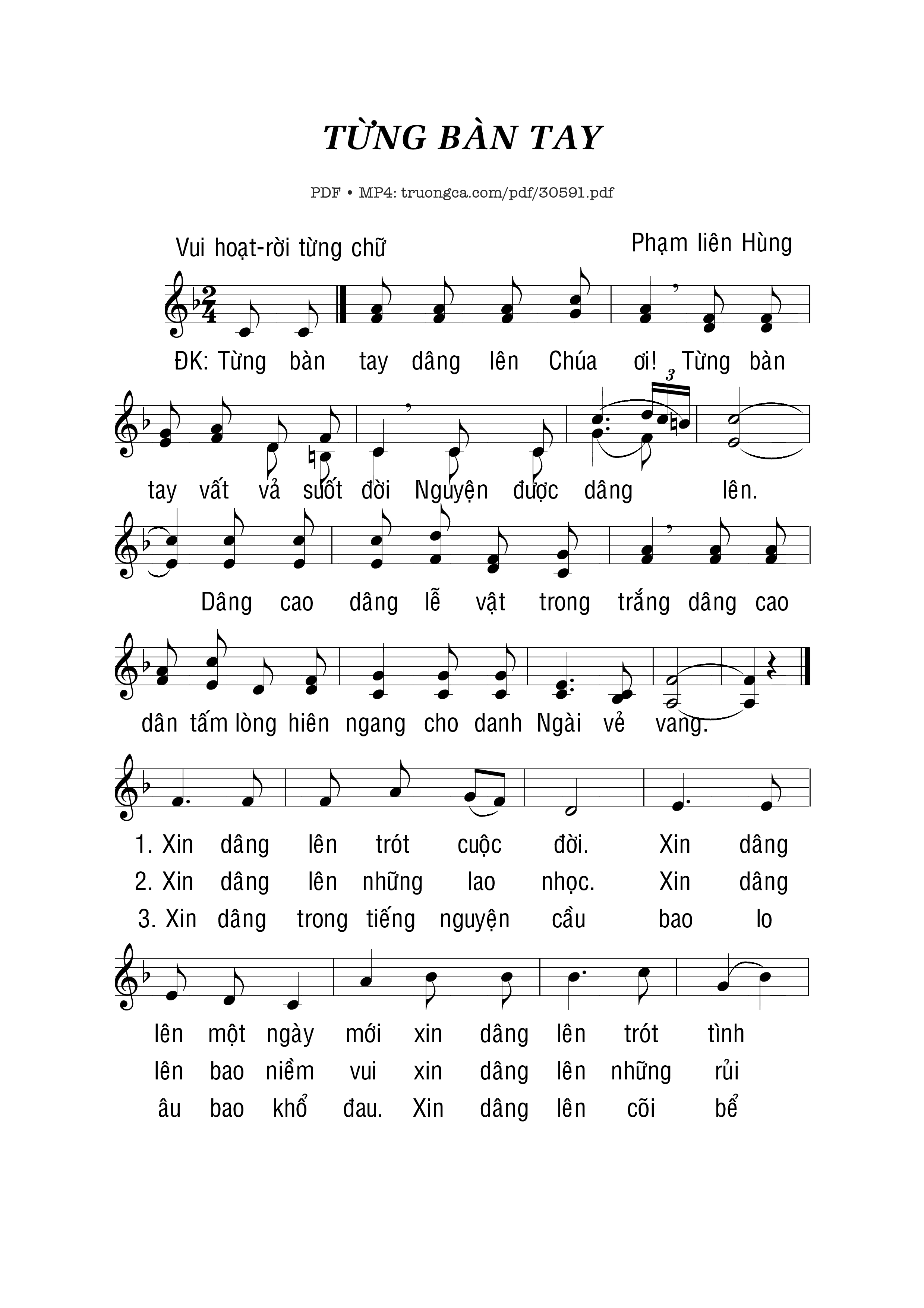 Sheet music Từng bàn tay by Phạm Liên Hùng and PDF file was posted here to support you to practice singing perfectly. Sheets with notes and chords are for reference only, for non-commercial purposes only, not involved with earning money by buying and selling. Copyright is belong to song writer/author and copyright owner. Truongca.com do not own any copyrighted content. You can download the high-quality PDF files which contain staffs by PDF link above.