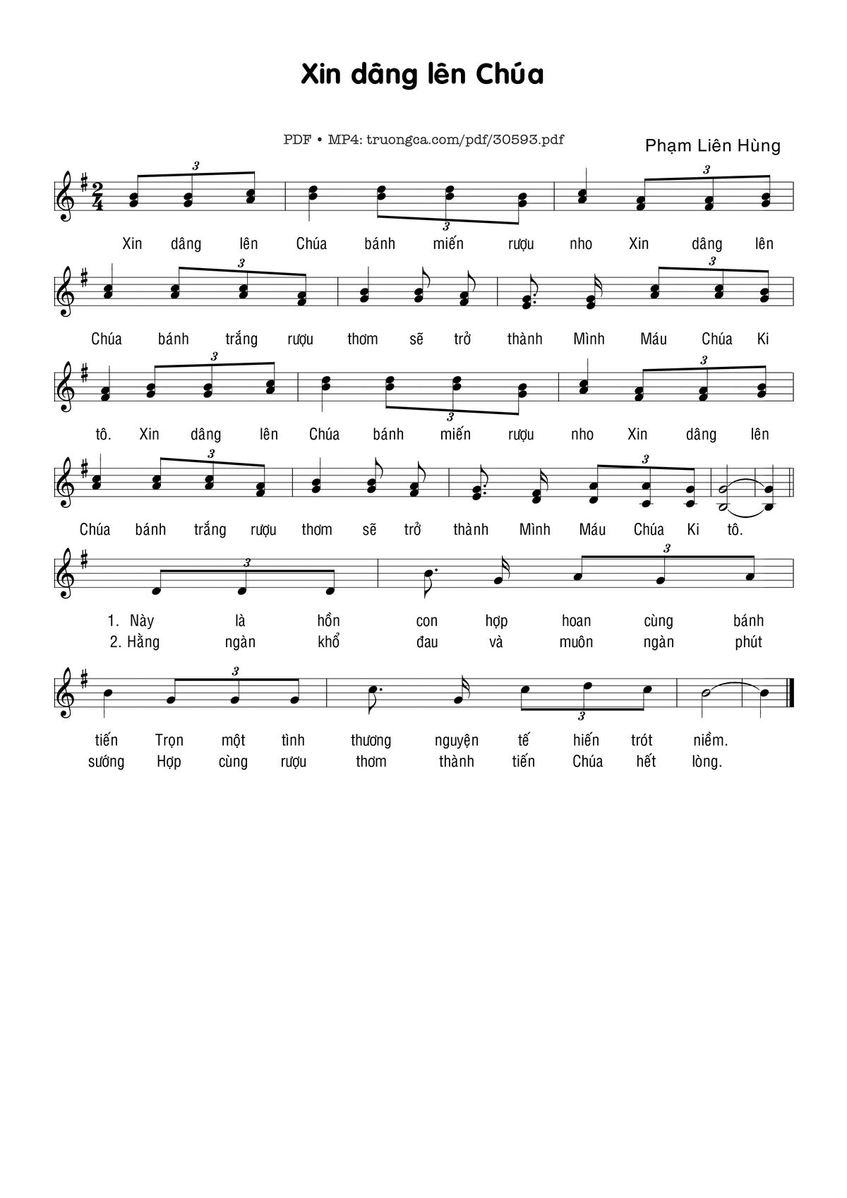 Sheet music Xin dâng lên Chúa by Phạm Liên Hùng and PDF file was posted here to support you to practice singing perfectly. Sheets with notes and chords are for reference only, for non-commercial purposes only, not involved with earning money by buying and selling. Copyright is belong to song writer/author and copyright owner. Truongca.com do not own any copyrighted content. You can download the high-quality PDF files which contain staffs by PDF link above.