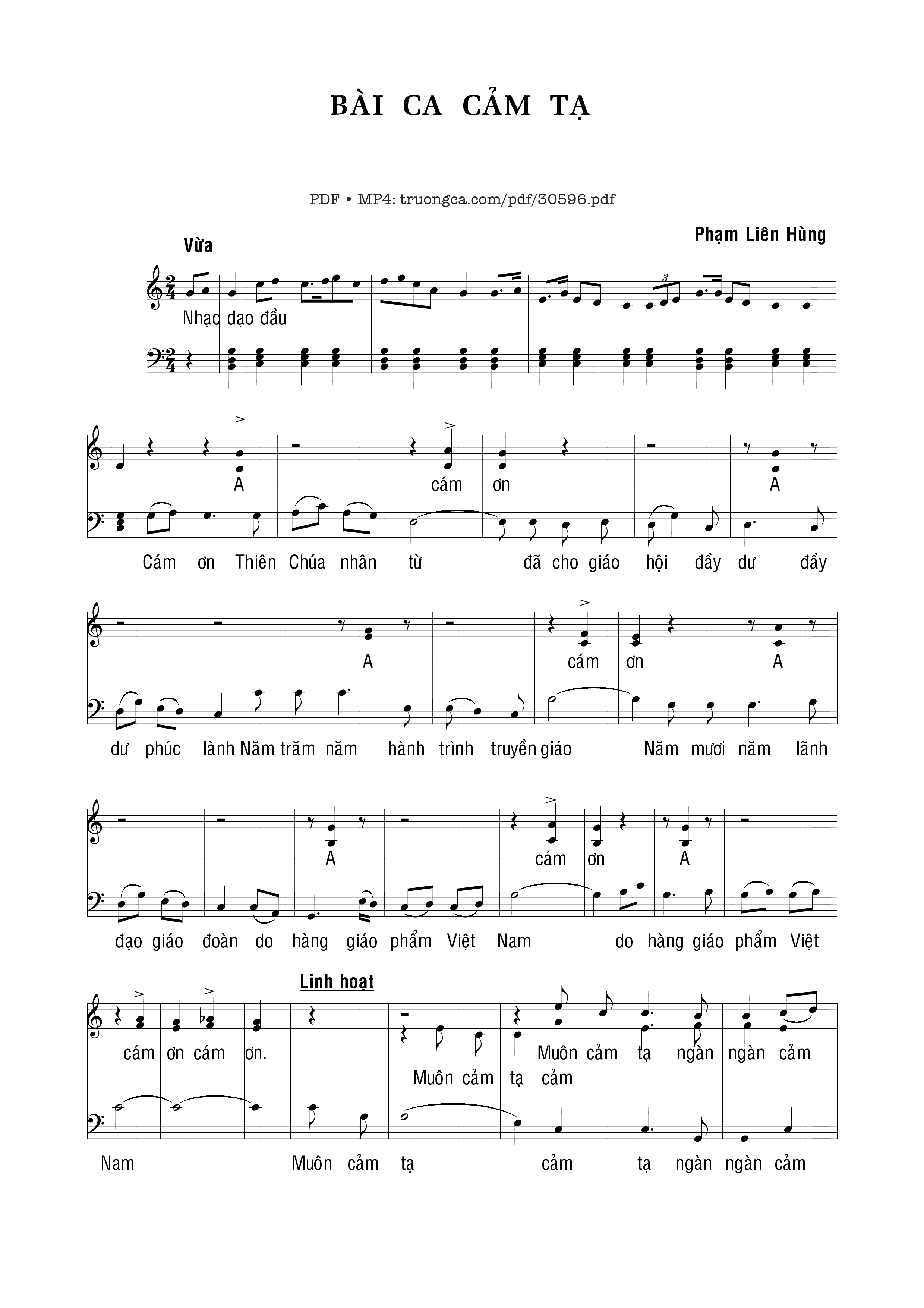 Sheet music Bài Ca Cảm Tạ by Phạm Liên Hùng and PDF file was posted here to support you to practice singing perfectly. Sheets with notes and chords are for reference only, for non-commercial purposes only, not involved with earning money by buying and selling. Copyright is belong to song writer/author and copyright owner. Truongca.com do not own any copyrighted content. You can download the high-quality PDF files which contain staffs by PDF link above.