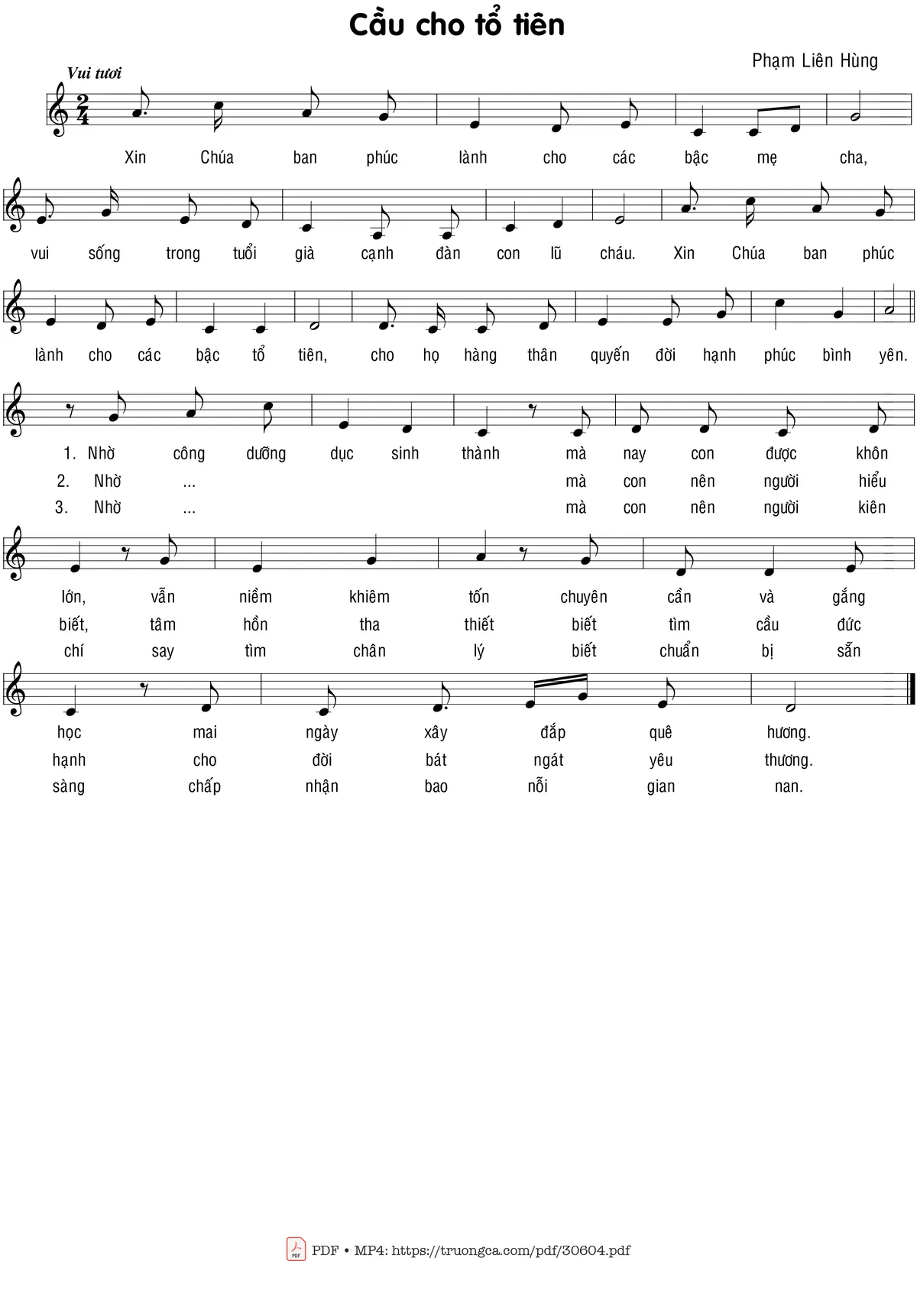 Sheet music Cầu cho Tổ tiên by Phạm Liên Hùng and PDF file was posted here to support you to practice singing perfectly. Sheets with notes and chords are for reference only, for non-commercial purposes only, not involved with earning money by buying and selling. Copyright is belong to song writer/author and copyright owner. Truongca.com do not own any copyrighted content. You can download the high-quality PDF files which contain staffs by PDF link above.