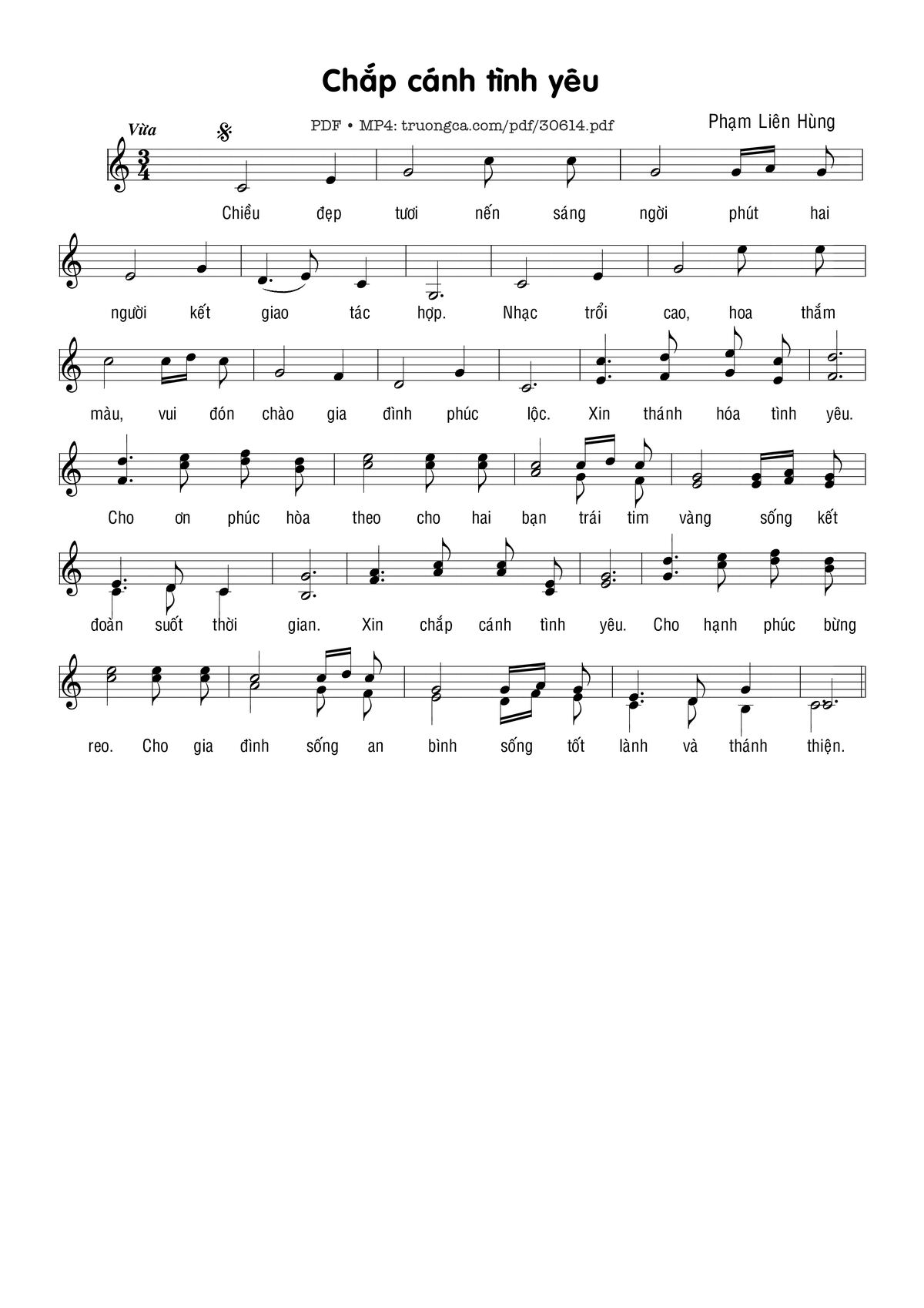 Sheet music Chấp cánh tình yêu by Phạm Liên Hùng and PDF file was posted here to support you to practice singing perfectly. Sheets with notes and chords are for reference only, for non-commercial purposes only, not involved with earning money by buying and selling. Copyright is belong to song writer/author and copyright owner. Truongca.com do not own any copyrighted content. You can download the high-quality PDF files which contain staffs by PDF link above.