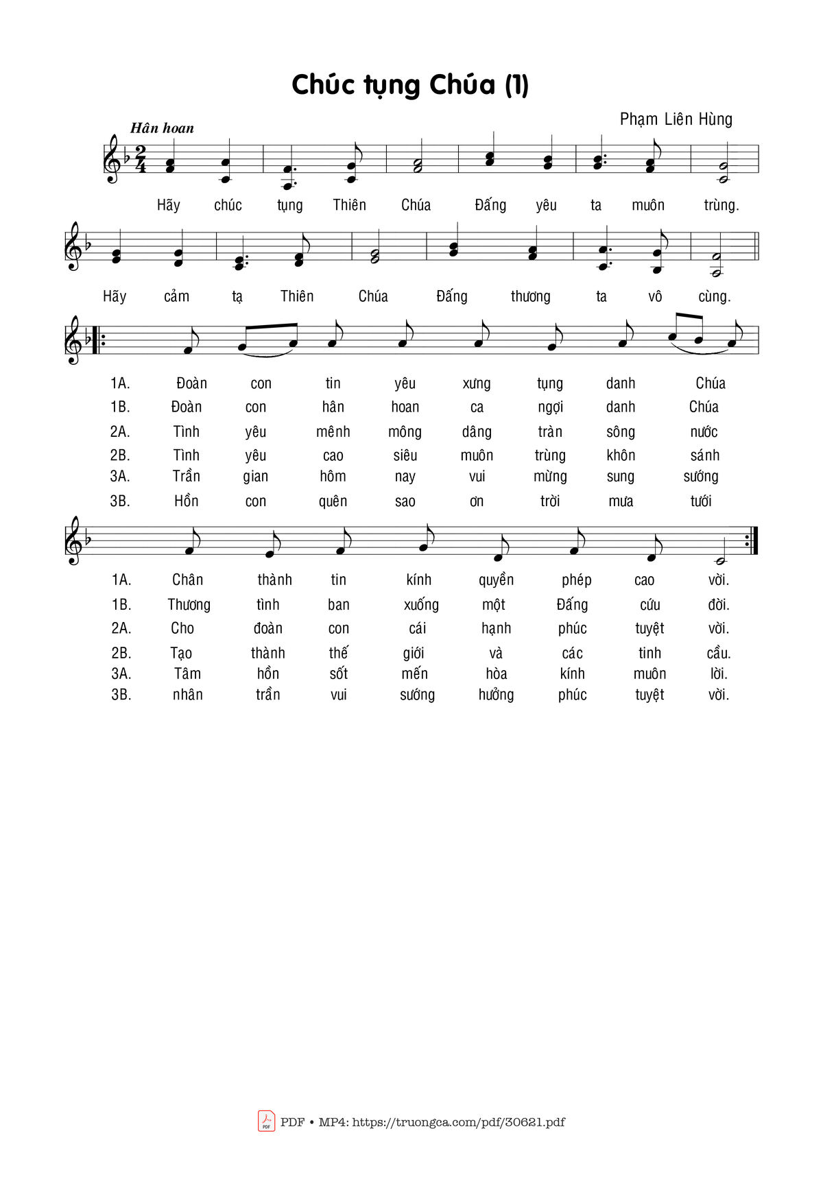 Sheet music Chúc tụng Chúa (1) by Phạm Liên Hùng and PDF file was posted here to support you to practice singing perfectly. Sheets with notes and chords are for reference only, for non-commercial purposes only, not involved with earning money by buying and selling. Copyright is belong to song writer/author and copyright owner. Truongca.com do not own any copyrighted content. You can download the high-quality PDF files which contain staffs by PDF link above.