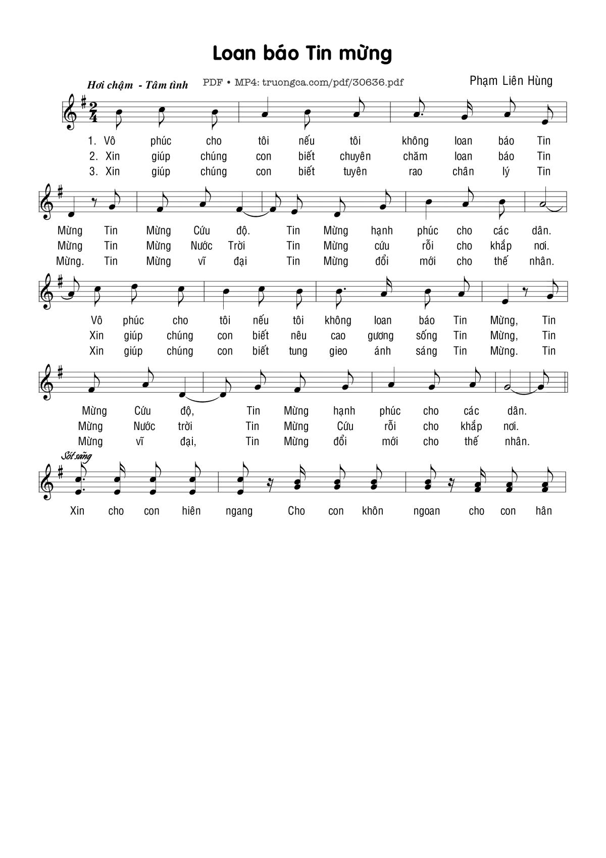 Sheet music Loan báo Tin Mừng by Phạm Liên Hùng and PDF file was posted here to support you to practice singing perfectly. Sheets with notes and chords are for reference only, for non-commercial purposes only, not involved with earning money by buying and selling. Copyright is belong to song writer/author and copyright owner. Truongca.com do not own any copyrighted content. You can download the high-quality PDF files which contain staffs by PDF link above.