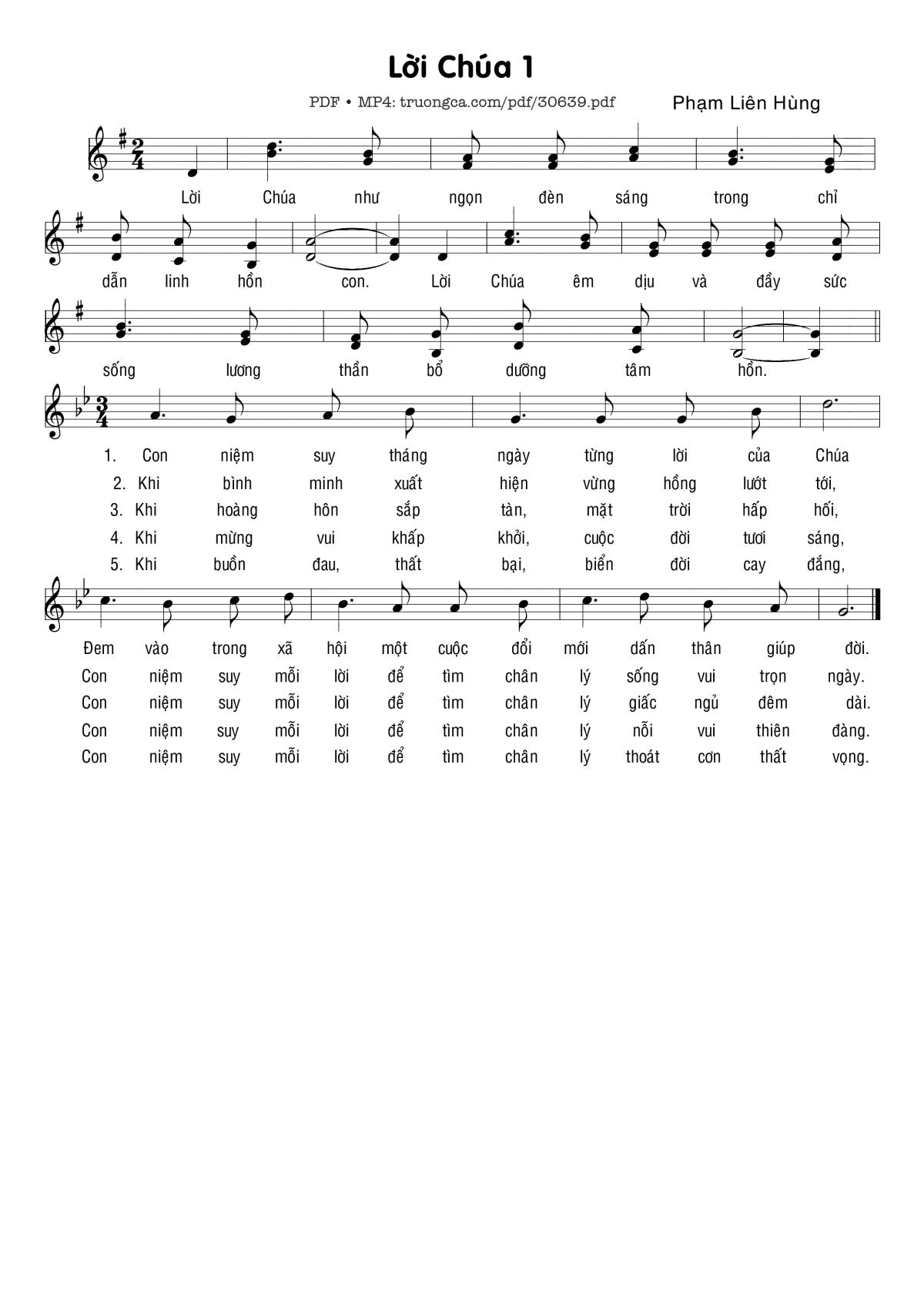 Sheet music Lời Chúa (1) by Phạm Liên Hùng and PDF file was posted here to support you to practice singing perfectly. Sheets with notes and chords are for reference only, for non-commercial purposes only, not involved with earning money by buying and selling. Copyright is belong to song writer/author and copyright owner. Truongca.com do not own any copyrighted content. You can download the high-quality PDF files which contain staffs by PDF link above.