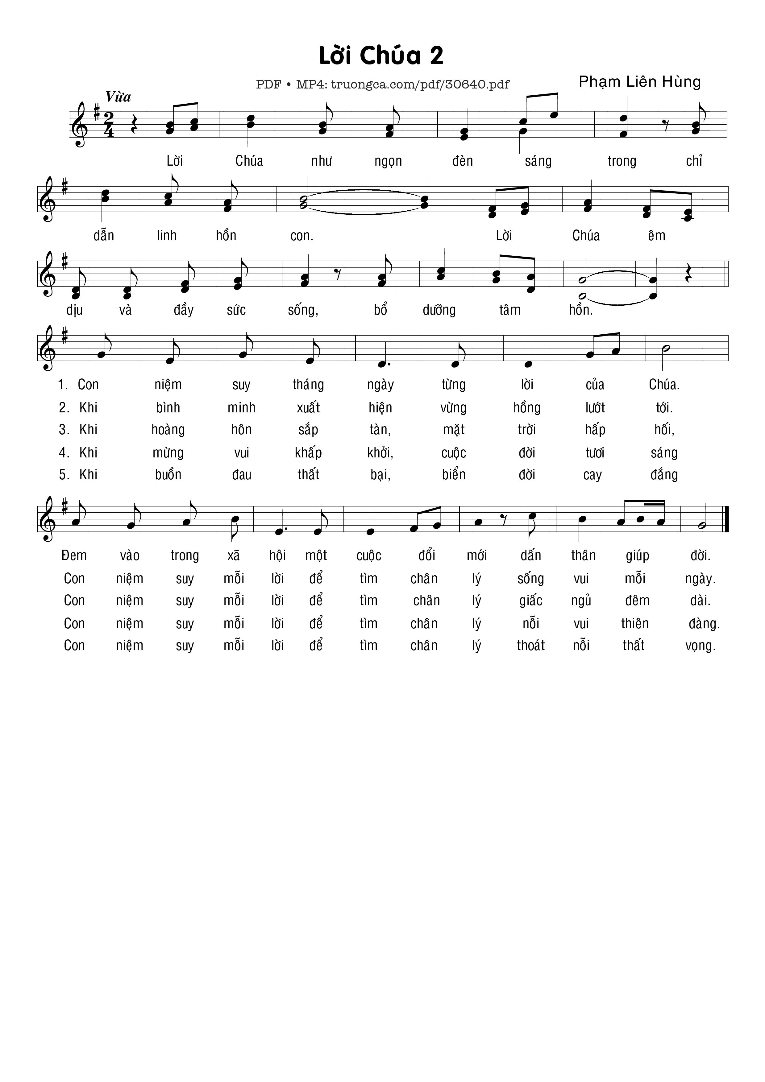 Sheet music Lời Chúa (2) by Phạm Liên Hùng and PDF file was posted here to support you to practice singing perfectly. Sheets with notes and chords are for reference only, for non-commercial purposes only, not involved with earning money by buying and selling. Copyright is belong to song writer/author and copyright owner. Truongca.com do not own any copyrighted content. You can download the high-quality PDF files which contain staffs by PDF link above.