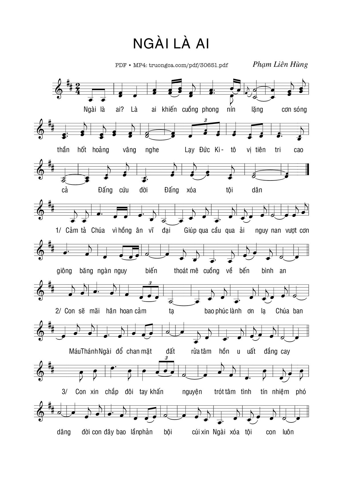 Sheet music Ngài là ai by Phạm Liên Hùng and PDF file was posted here to support you to practice singing perfectly. Sheets with notes and chords are for reference only, for non-commercial purposes only, not involved with earning money by buying and selling. Copyright is belong to song writer/author and copyright owner. Truongca.com do not own any copyrighted content. You can download the high-quality PDF files which contain staffs by PDF link above.