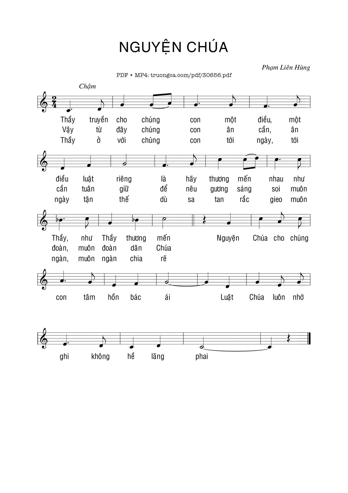 Sheet music Nguyện Chúa by Phạm Liên Hùng and PDF file was posted here to support you to practice singing perfectly. Sheets with notes and chords are for reference only, for non-commercial purposes only, not involved with earning money by buying and selling. Copyright is belong to song writer/author and copyright owner. Truongca.com do not own any copyrighted content. You can download the high-quality PDF files which contain staffs by PDF link above.