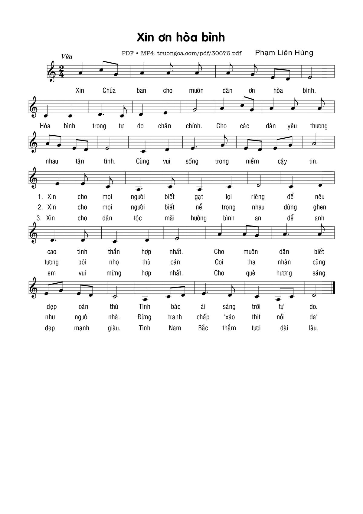 Sheet music Xin Ơn Hòa Bình by Phạm Liên Hùng and PDF file was posted here to support you to practice singing perfectly. Sheets with notes and chords are for reference only, for non-commercial purposes only, not involved with earning money by buying and selling. Copyright is belong to song writer/author and copyright owner. Truongca.com do not own any copyrighted content. You can download the high-quality PDF files which contain staffs by PDF link above.