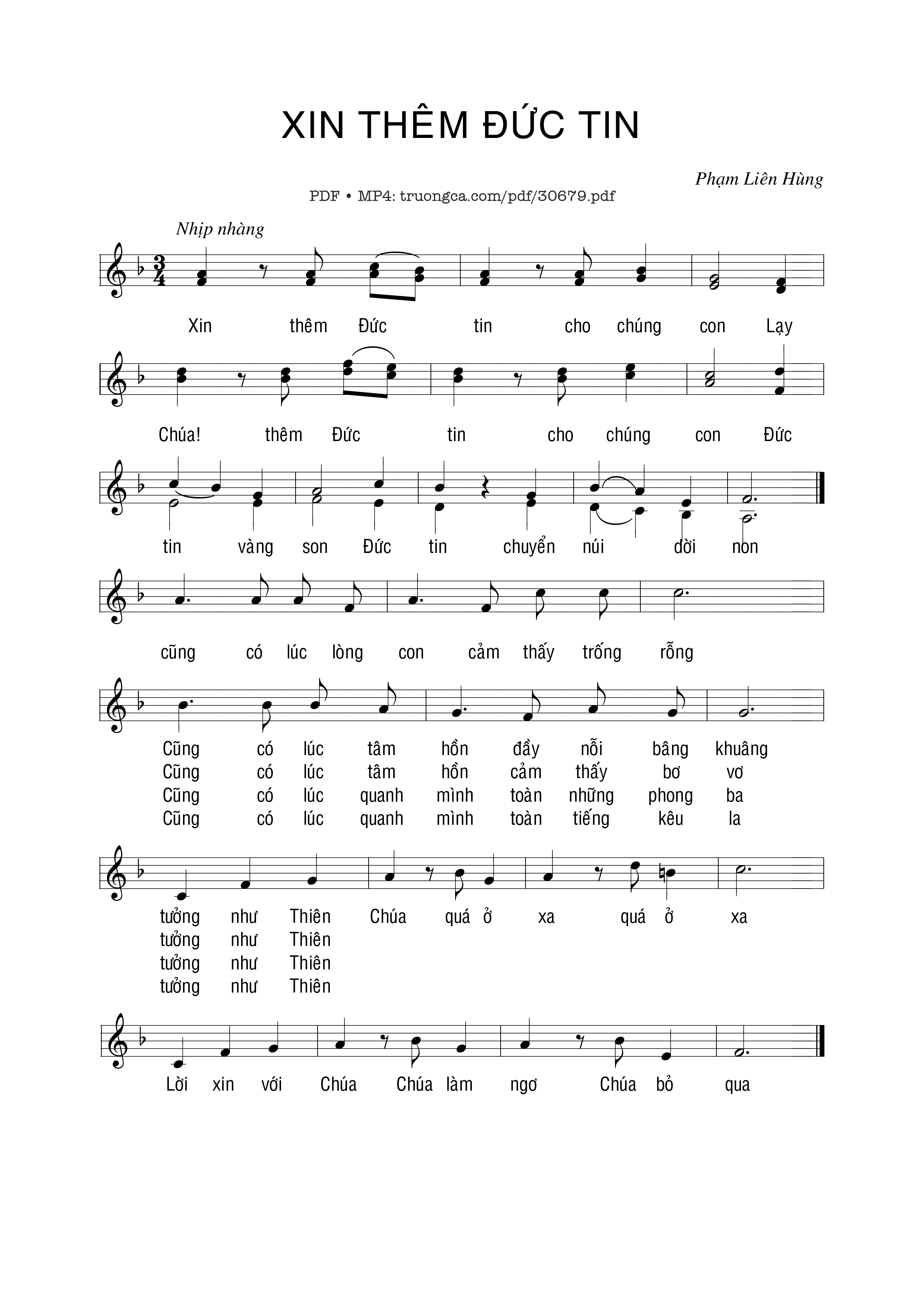 Sheet music Xin Thêm Đức Tin by Phạm Liên Hùng and PDF file was posted here to support you to practice singing perfectly. Sheets with notes and chords are for reference only, for non-commercial purposes only, not involved with earning money by buying and selling. Copyright is belong to song writer/author and copyright owner. Truongca.com do not own any copyrighted content. You can download the high-quality PDF files which contain staffs by PDF link above.