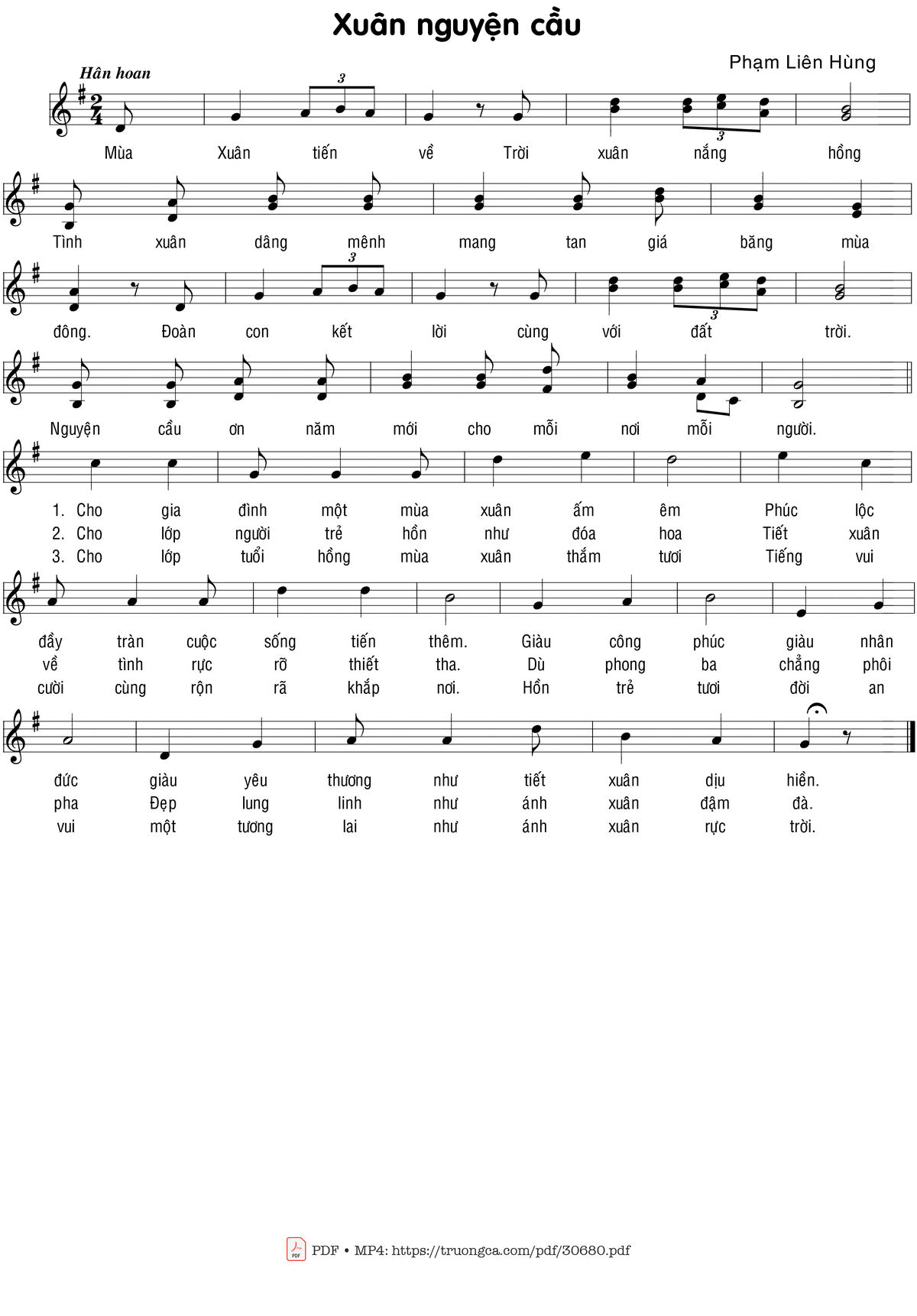 Sheet music Xuân Nguyện Cầu by Phạm Liên Hùng and PDF file was posted here to support you to practice singing perfectly. Sheets with notes and chords are for reference only, for non-commercial purposes only, not involved with earning money by buying and selling. Copyright is belong to song writer/author and copyright owner. Truongca.com do not own any copyrighted content. You can download the high-quality PDF files which contain staffs by PDF link above.