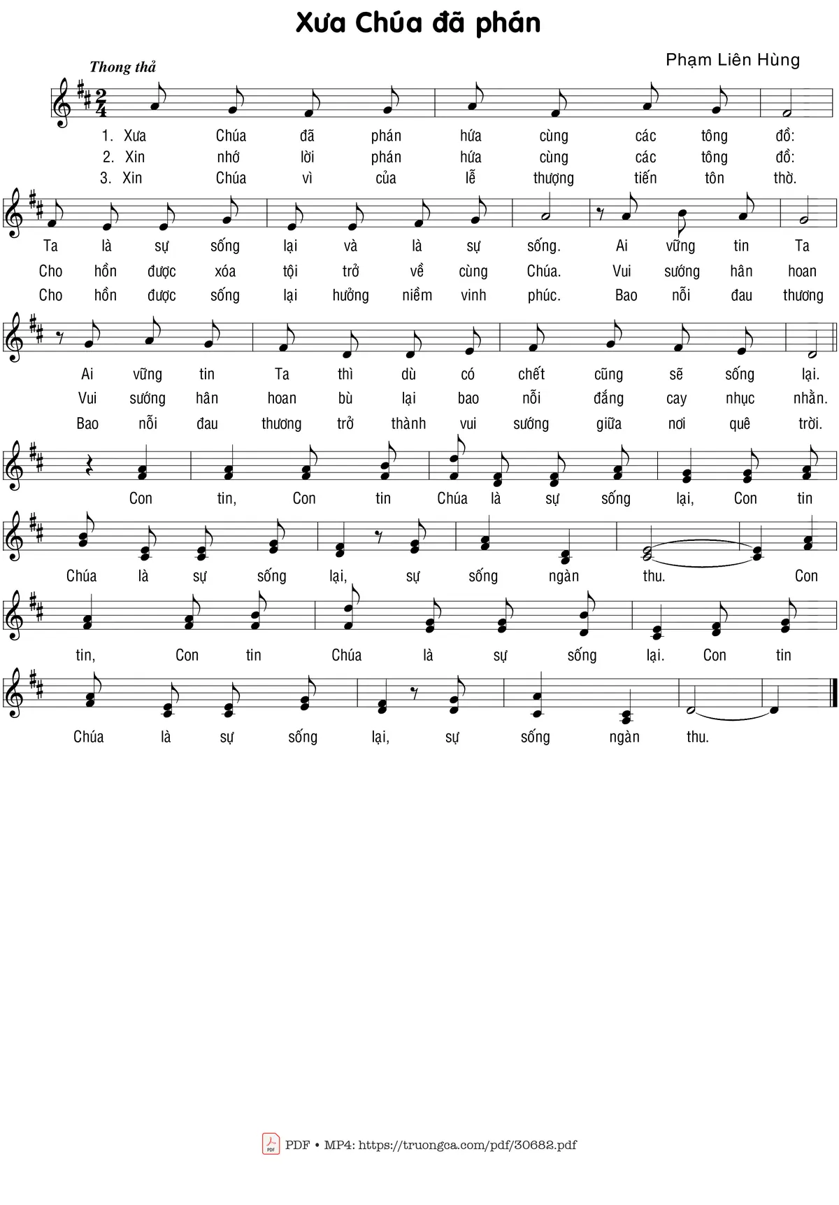 Sheet music Xưa Chúa đã phán by Phạm Liên Hùng and PDF file was posted here to support you to practice singing perfectly. Sheets with notes and chords are for reference only, for non-commercial purposes only, not involved with earning money by buying and selling. Copyright is belong to song writer/author and copyright owner. Truongca.com do not own any copyrighted content. You can download the high-quality PDF files which contain staffs by PDF link above.