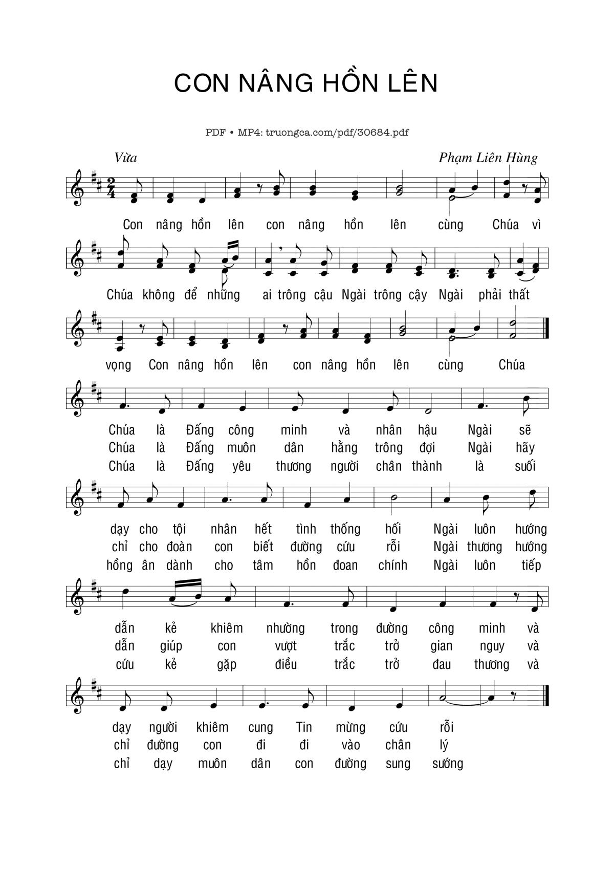 Sheet music Con Nâng Hồn Lên by Phạm Liên Hùng and PDF file was posted here to support you to practice singing perfectly. Sheets with notes and chords are for reference only, for non-commercial purposes only, not involved with earning money by buying and selling. Copyright is belong to song writer/author and copyright owner. Truongca.com do not own any copyrighted content. You can download the high-quality PDF files which contain staffs by PDF link above.