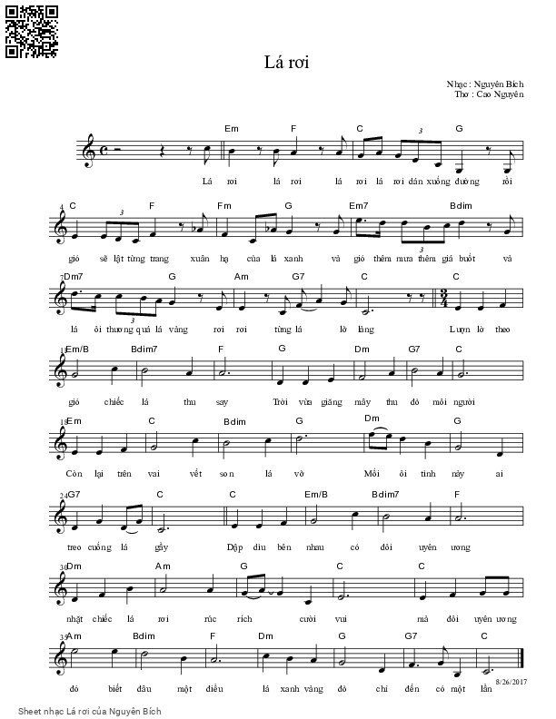 Nguyên Bích Lá rơi lá rơi lá rơi lá rơi giăng xuống đường [PDF] [Sheet] [Lyrics] [Mp4/Midi]