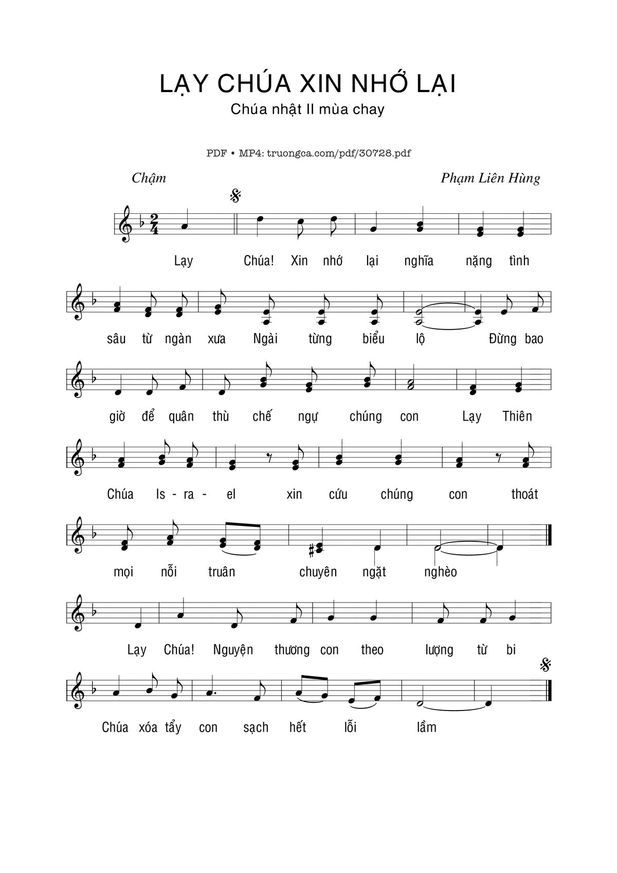 Sheet music Lạy Chúa xin nhớ lại by Phạm Liên Hùng and PDF file was posted here to support you to practice singing perfectly. Sheets with notes and chords are for reference only, for non-commercial purposes only, not involved with earning money by buying and selling. Copyright is belong to song writer/author and copyright owner. Truongca.com do not own any copyrighted content. You can download the high-quality PDF files which contain staffs by PDF link above.