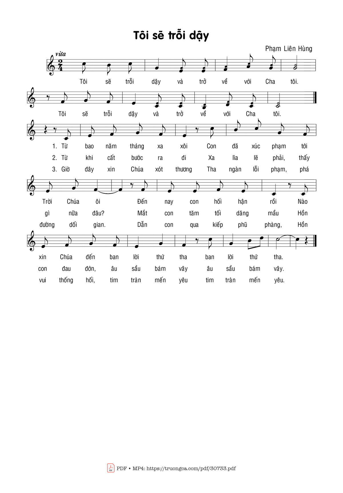 Sheet music Tôi sẽ chỗi dậy by Phạm Liên Hùng and PDF file was posted here to support you to practice singing perfectly. Sheets with notes and chords are for reference only, for non-commercial purposes only, not involved with earning money by buying and selling. Copyright is belong to song writer/author and copyright owner. Truongca.com do not own any copyrighted content. You can download the high-quality PDF files which contain staffs by PDF link above.